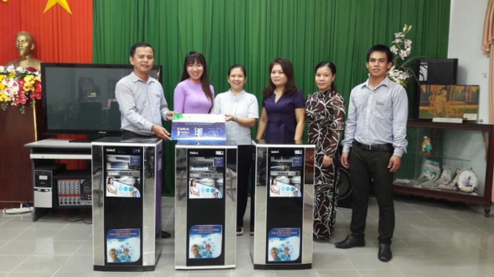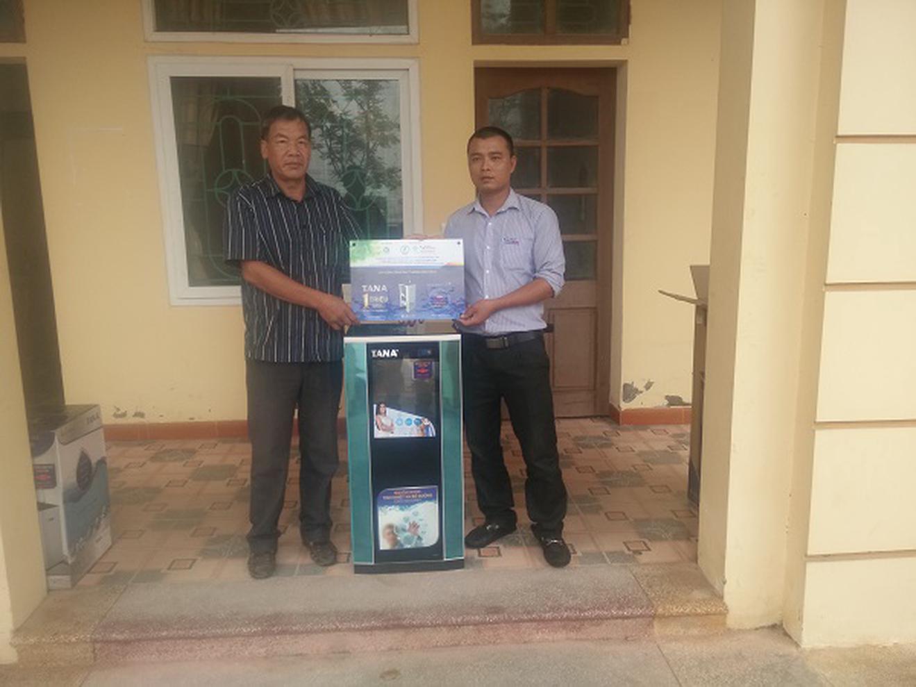 Đại diện Tân Á Đại Thành trao tặng máy lọc nước cho cán bộ khu di tích Sơn Mỹ - Quảng Ngãi. Ảnh: Hồng Linh