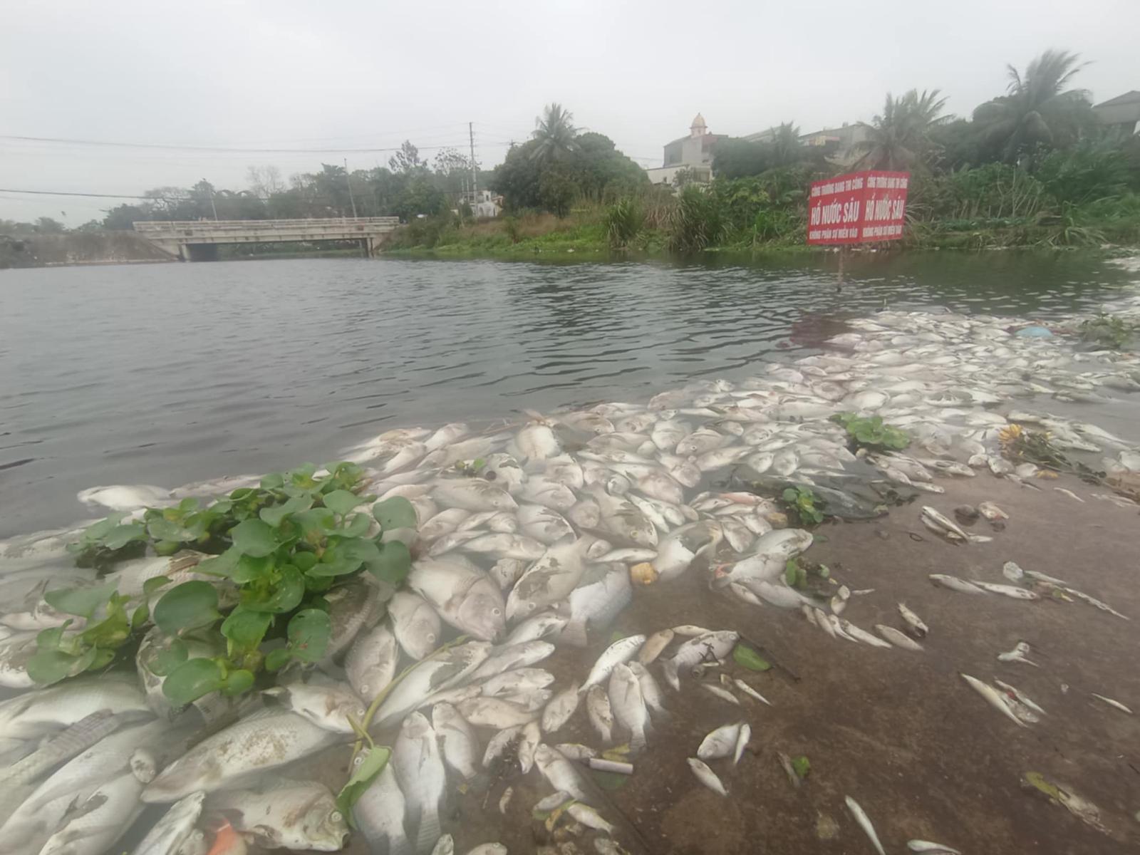 Theo ghi nhận của phóng viên, vào chiều ngày 24/2, trên mặt suối Cổ Đam rộng hàng nghìn m2 từ chân cầu Cổ Đam đến đập tràn phía hạ lưu, xác cá nổi trắng, chất thành từng đống lớn, ruồi nhặng bu đầy.