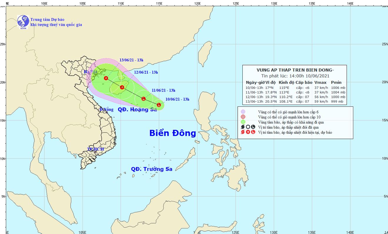 Trung tâm Dự báo khí tượng thủy văn quốc gia cho biết, chiều ngày 10/6, ở vùng biển phía Đông quần đảo Hoàng Sa hình thành một vùng áp thấp. Hồi 13 giờ ngày 10/6, vị trí trung tâm vùng áp thấp ở vào khoảng 16,5 - 17,5 độ Vĩ Bắc; 114,5 - 115,5 độ Kinh Đông, cách quần đảo Hoàng Sa khoảng 200km về phía Đông.