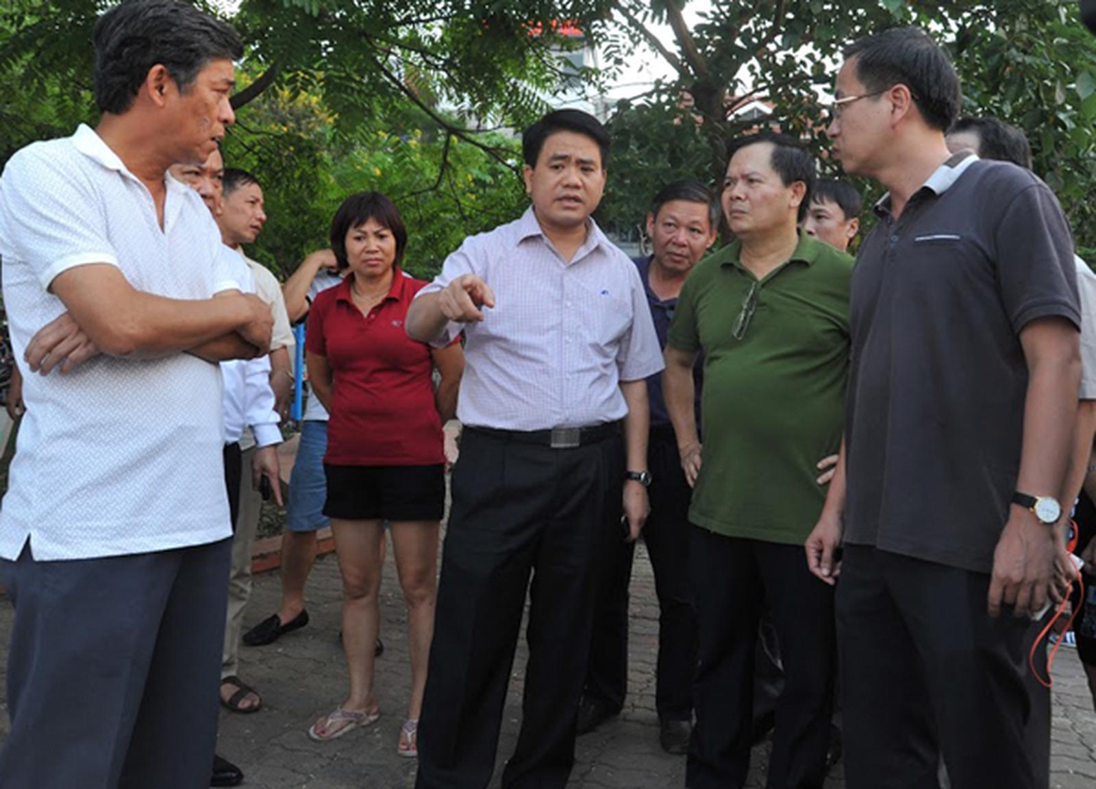 Chủ tịch UBND TP Nguyễn Đức Chung cùng Phó Chủ tịch Nguyễn Thế Hùng đã đến hiện trường tại khu vực đường Nguyễn Đình Thi trực tiếp chỉ đạo công tác xử lý tình trạng cá chết bất thường. Ảnh: TN