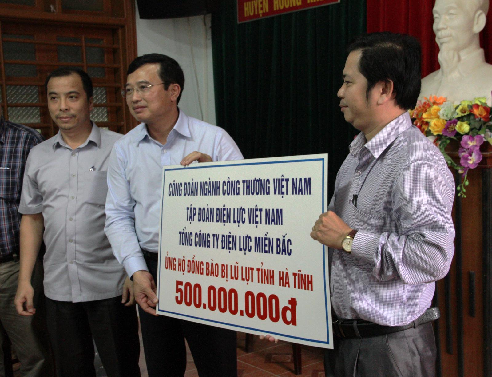 Tổng Công ty Điện lực Miền Bắc đã trao số tiền 500 triệu đồng, 500 thùng mỳ tôm cho nhân dân vùng lũ. Ảnh: Hải Yến