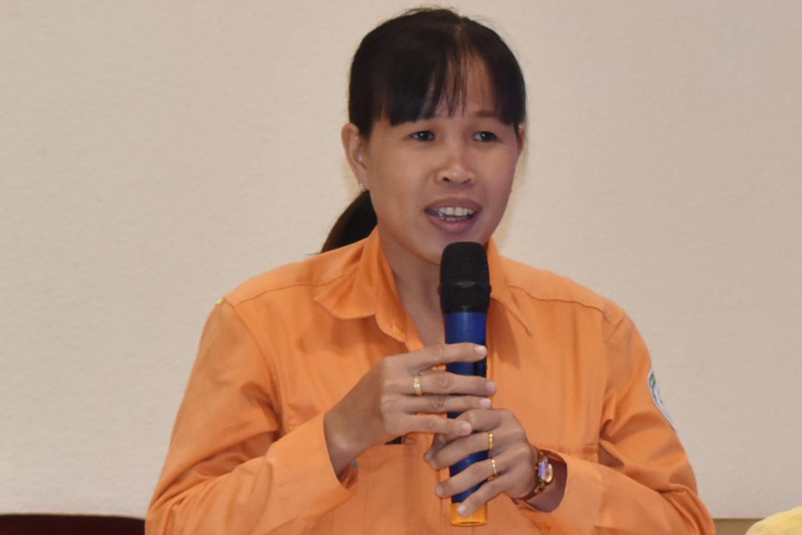 Chị Trần Thị Anh Xuân, công nhân Công ty TNHH MTV Dịch vụ Công ích đô thị quận 1 chia sẻ ý kiến tại hội nghị. (Ảnh: TM)