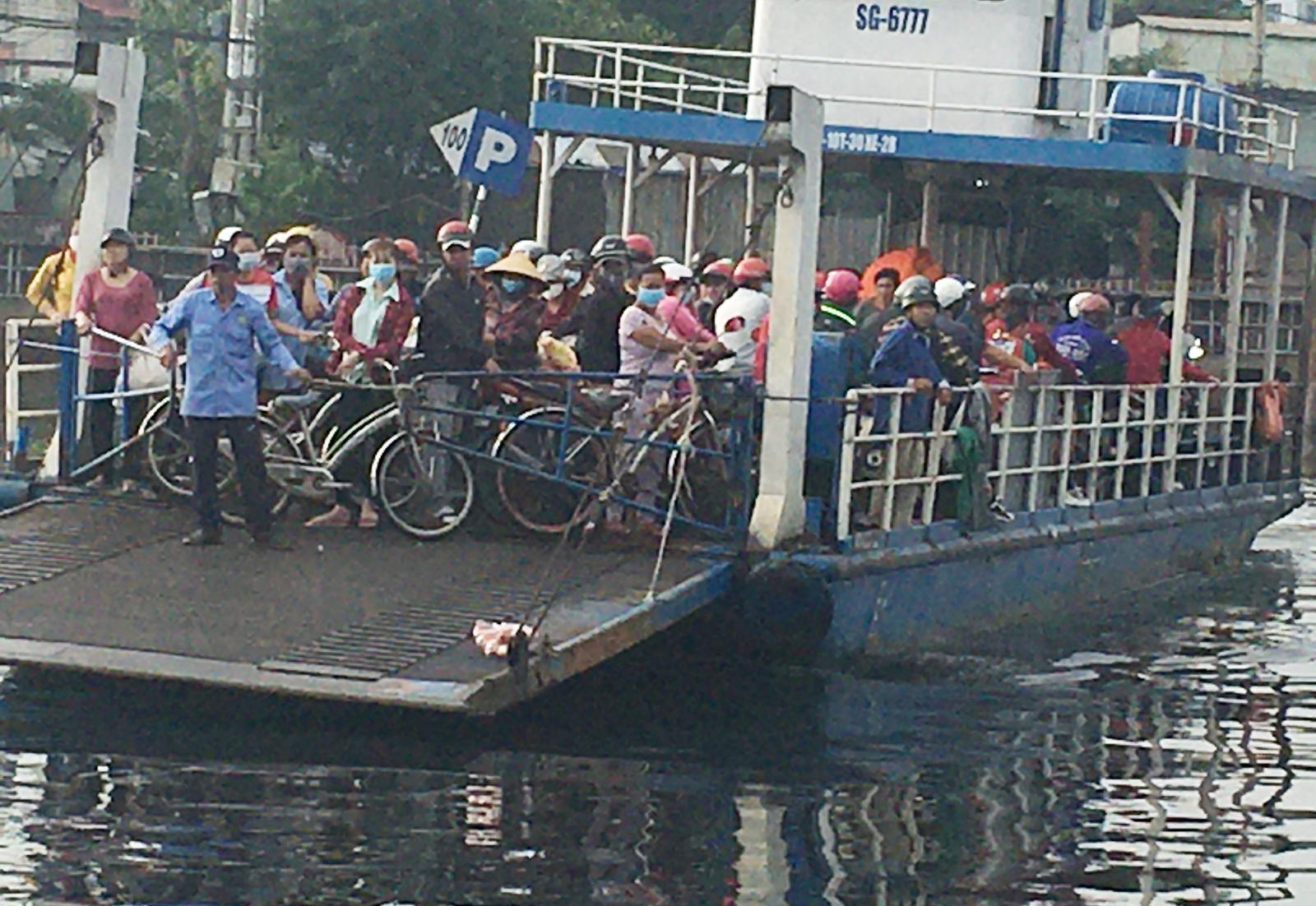 Hành khách chen lấn, không mặc áo phao khi qua phà. Ảnh: Thu Huyền