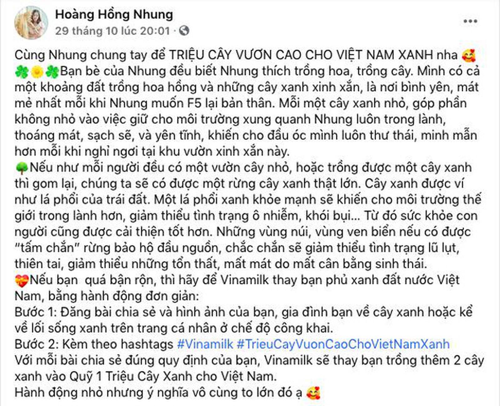 Hot mom" Hồng Nhung bày tỏ trên trang cá nhân về chiến dịch của Quỹ 1 Triệu Cây Xanh cho Việt Nam