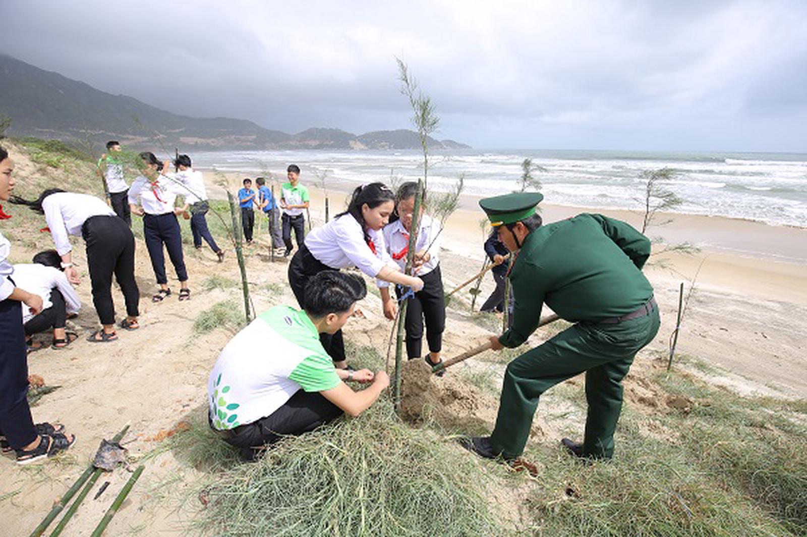 Các học sinh, đoàn viên thanh niên, chiến sĩ bộ đội cùng tham gia trồng cây trong chương trình Quỹ trao tặng 110.000 cây xanh tại tỉnh Bình Định