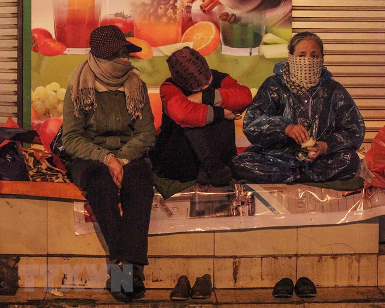 Người lao động co ro trong giá lạnh trên phố Tràng Thi, quận Hoàn Kiếm, đêm 28/12/2018. (Ảnh: Minh Hoàng/TTXVN phát)