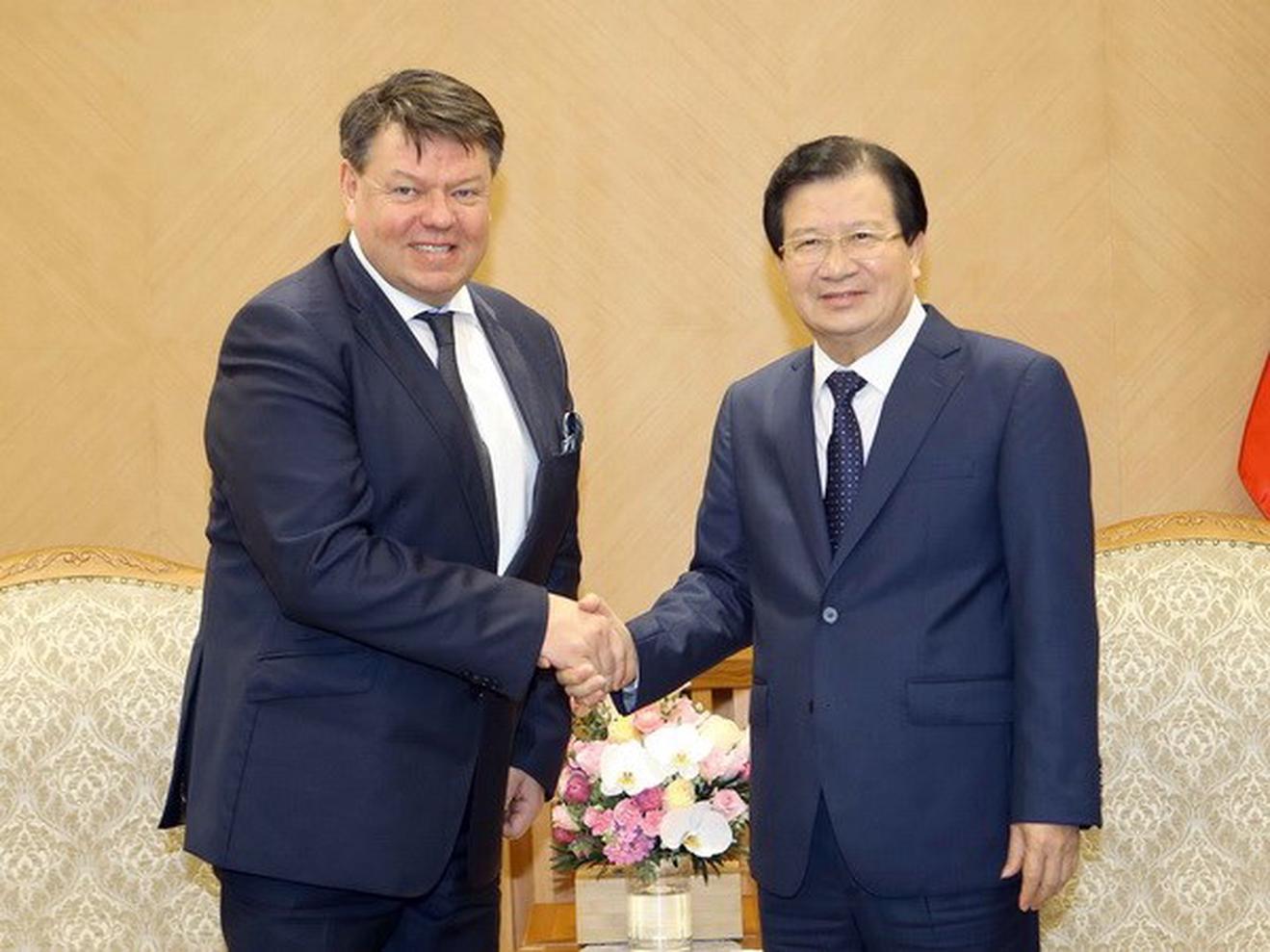 Phó Thủ tướng Trịnh Đình Dũng tiếp ông Petteri Taalas, Tổng Thư ký Tổ chức Khí tưởng thế giới (WMO). (Ảnh: Doãn Tấn/TTXVN)