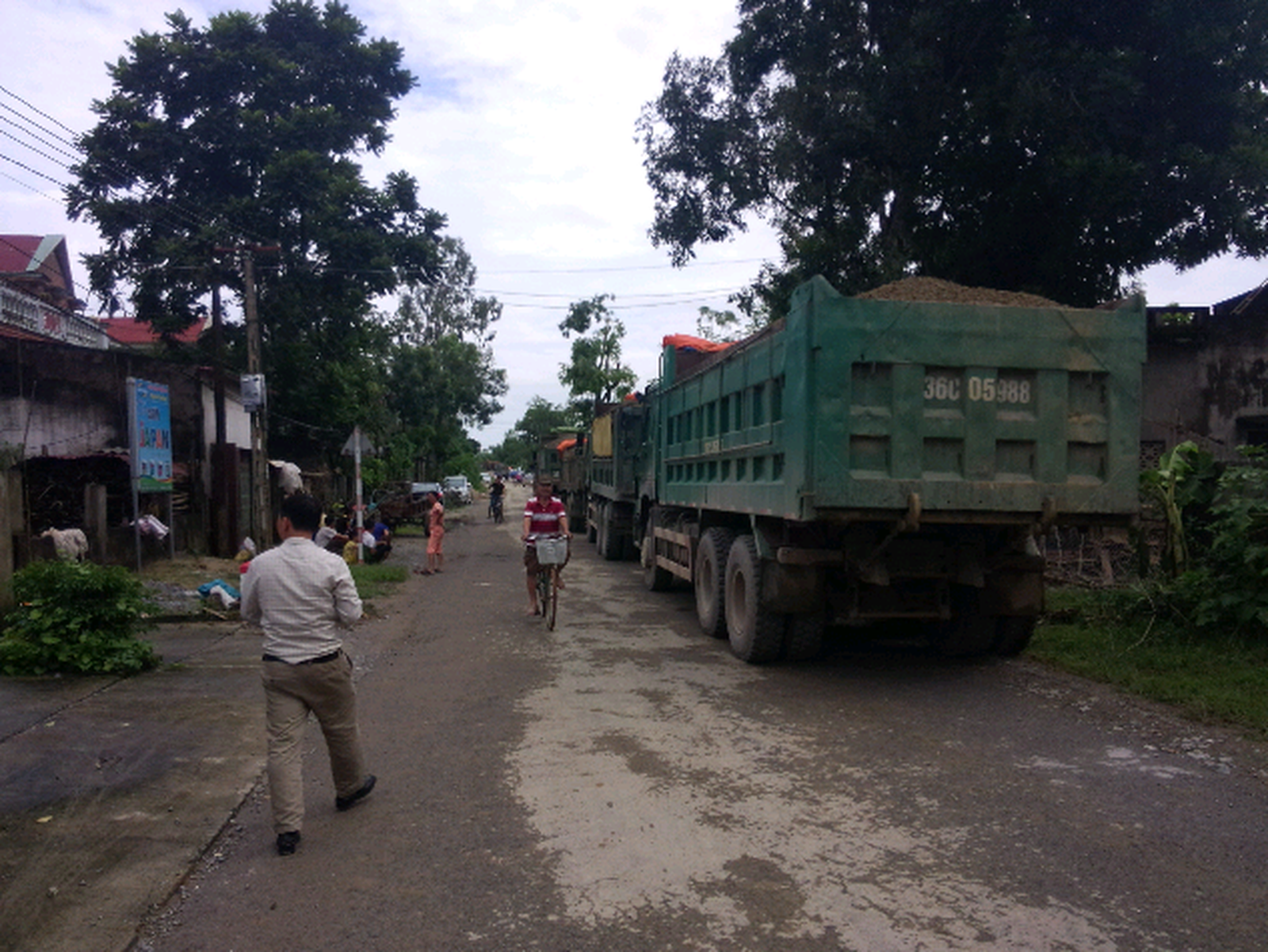 Xe ô tô chở đất đá được huy động đến hiện trường xã Xuân Minh để đối phó với nước lũ. Ảnh: Văn Thanh
