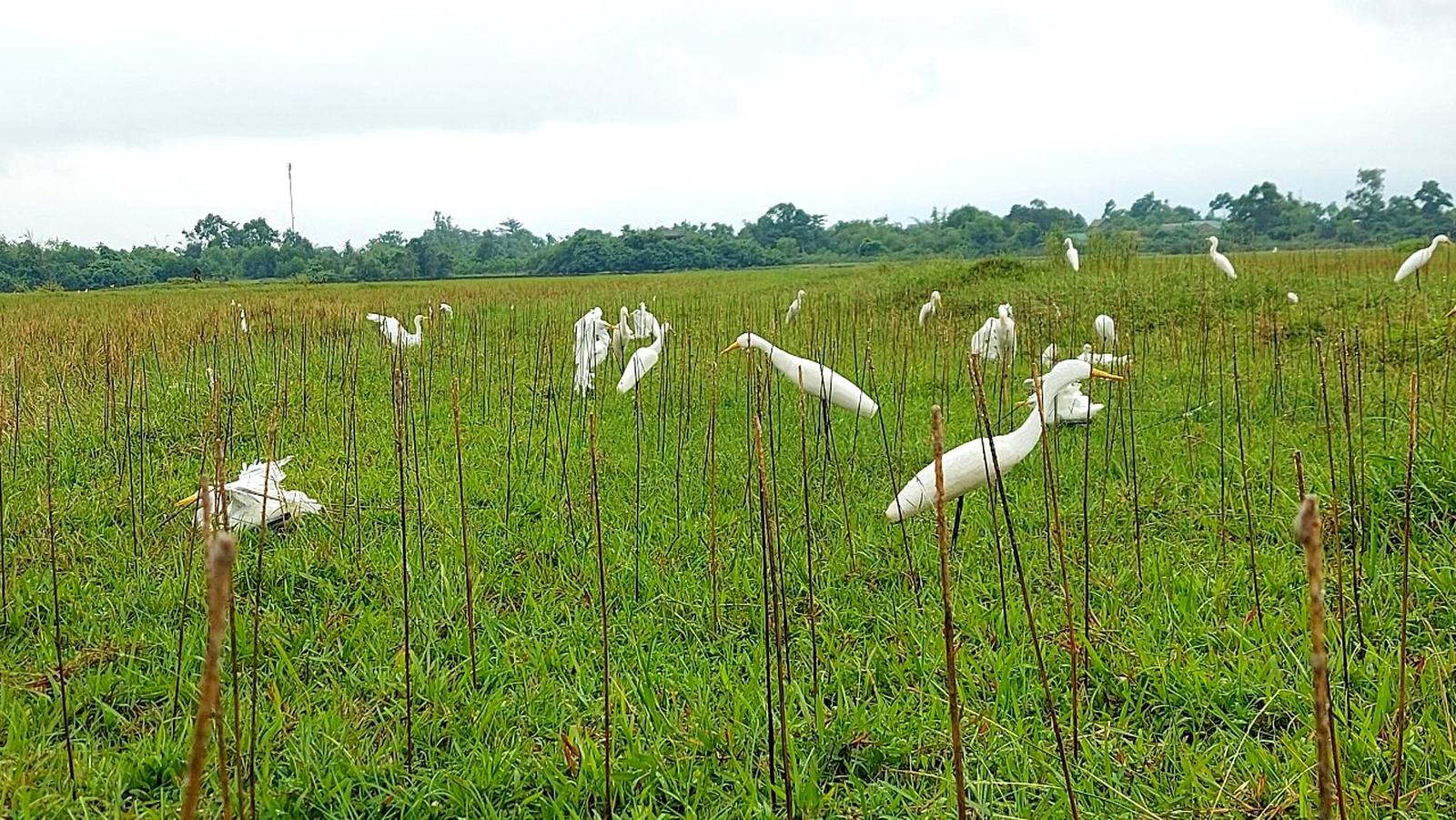 Một "ma trận" cò giả, keo dính và những chú cò xấu số trên đồng ruộng huyện Hải Lăng. Ảnh: Minh Tân