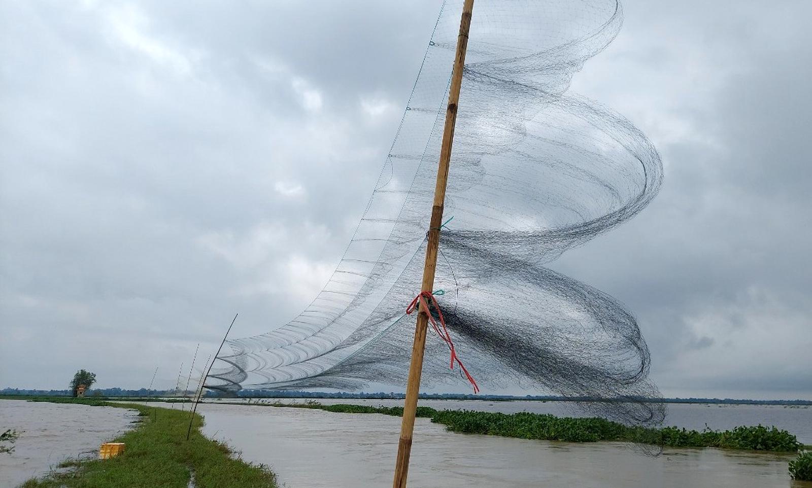 Hàng trăm mét lưới "tàng hình" trên đồng ruộng khiến không thể con chim di cư nào có thể thoát. Ảnh: Minh Tân