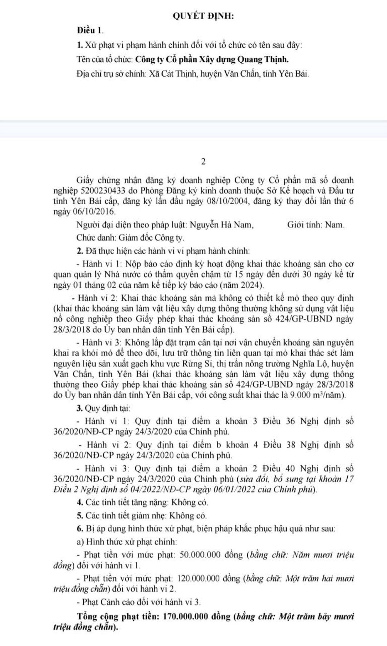 Với các vi phạm trên, UBND tỉnh Yên Bái đã quyết định áp dụng hình thức phạt tiền với tổng mức phạt là 170 triệu đồng và phạt cảnh cáo