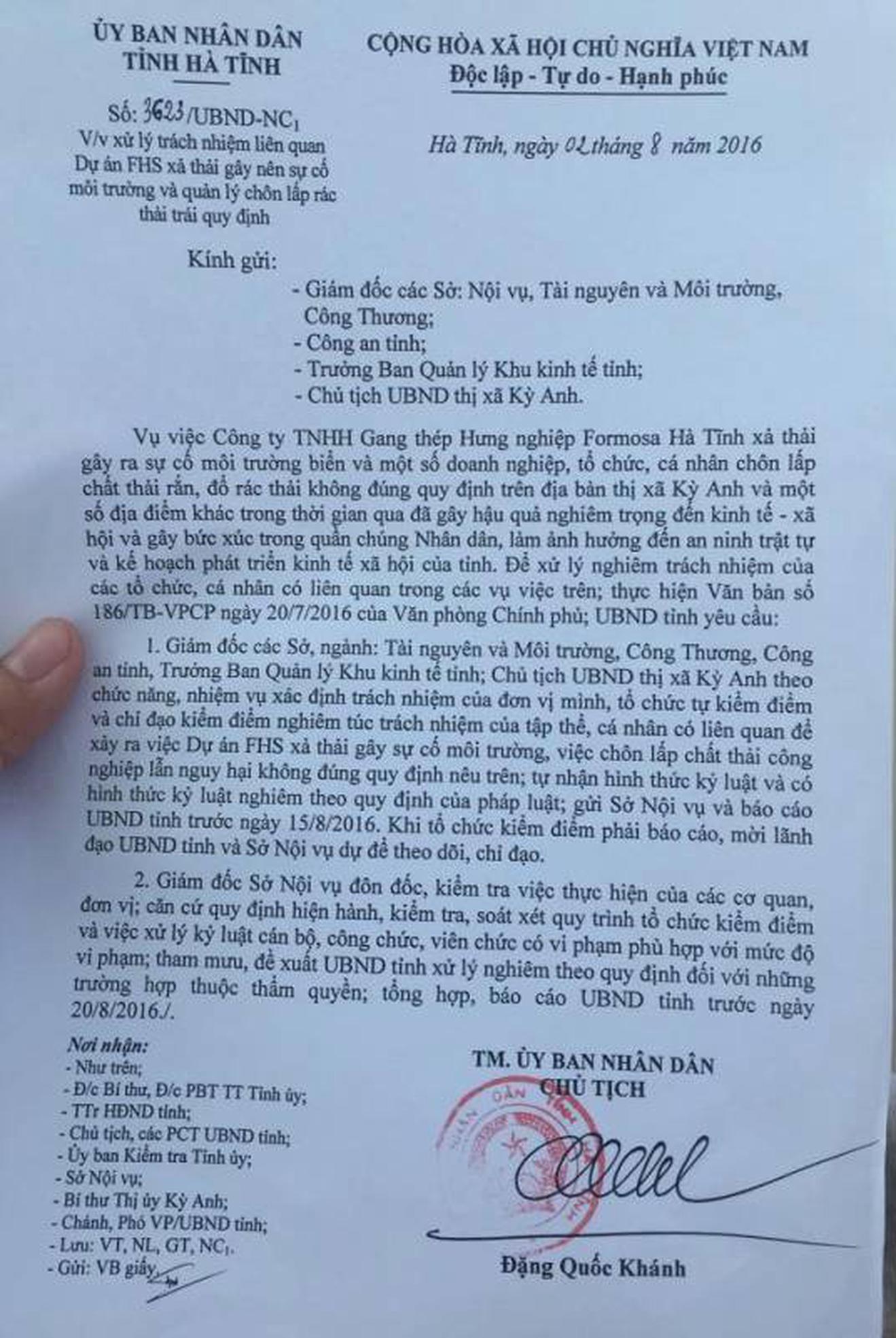 Văn bản của Chủ tịch tỉnh yêu cầu kiểm điểm tập thể, cá nhân liên quan đến sự cố môi trường Formosa. Ảnh: Hải Yến