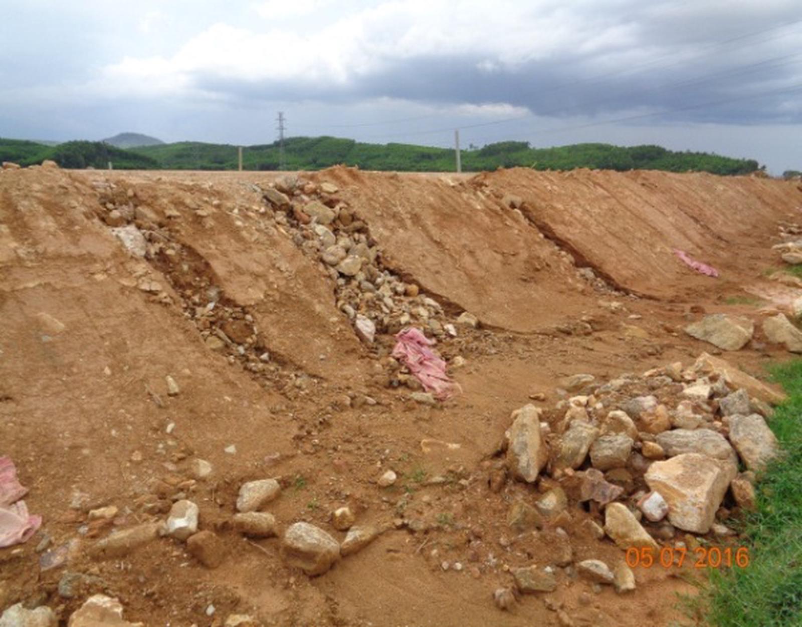Việc đắp đất nền đường xen lẫn đá to dễ gây sụt lún sau này. Ảnh: NP