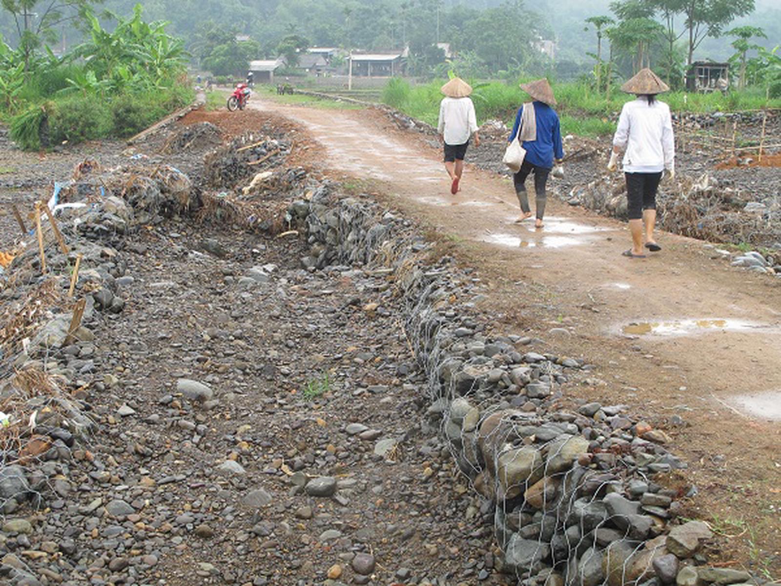 Nhà thầu bỏ cuộc, dân tự kè đá làm đường đi. Ảnh: Hồng Bài