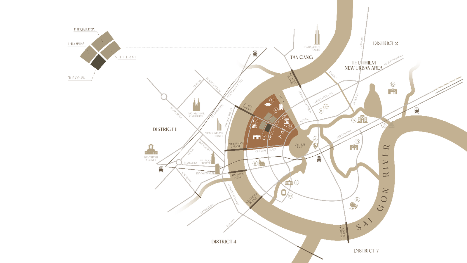 Theo quy hoạch của Sasaki (Hoa Kỳ), Khu chức năng số 1 bao gồm một nửa phía Bắc "Khu Lõi Trung tâm" của Thủ Thiêm và là khu thương mại đa chức năng mật độ cao được quy hoạch chuẩn chỉnh. Cả khu vực được bao quanh bởi 3 mặt nước của sông Sài Gòn và nằm trực diện với trung tâm Quận 1. Tại Khu chức năng số 1, đại lộ Vòng Cung là trục đường xương sống chính, với nhóm những tòa tháp cao nhất dọc theo cạnh tuyến đường và giảm dần chiều cao về phía sông Sài Gòn và hồ Trung Tâm, tạo ra lợi thế về giao thông cũng như tầm nhìn tuyệt đẹp.