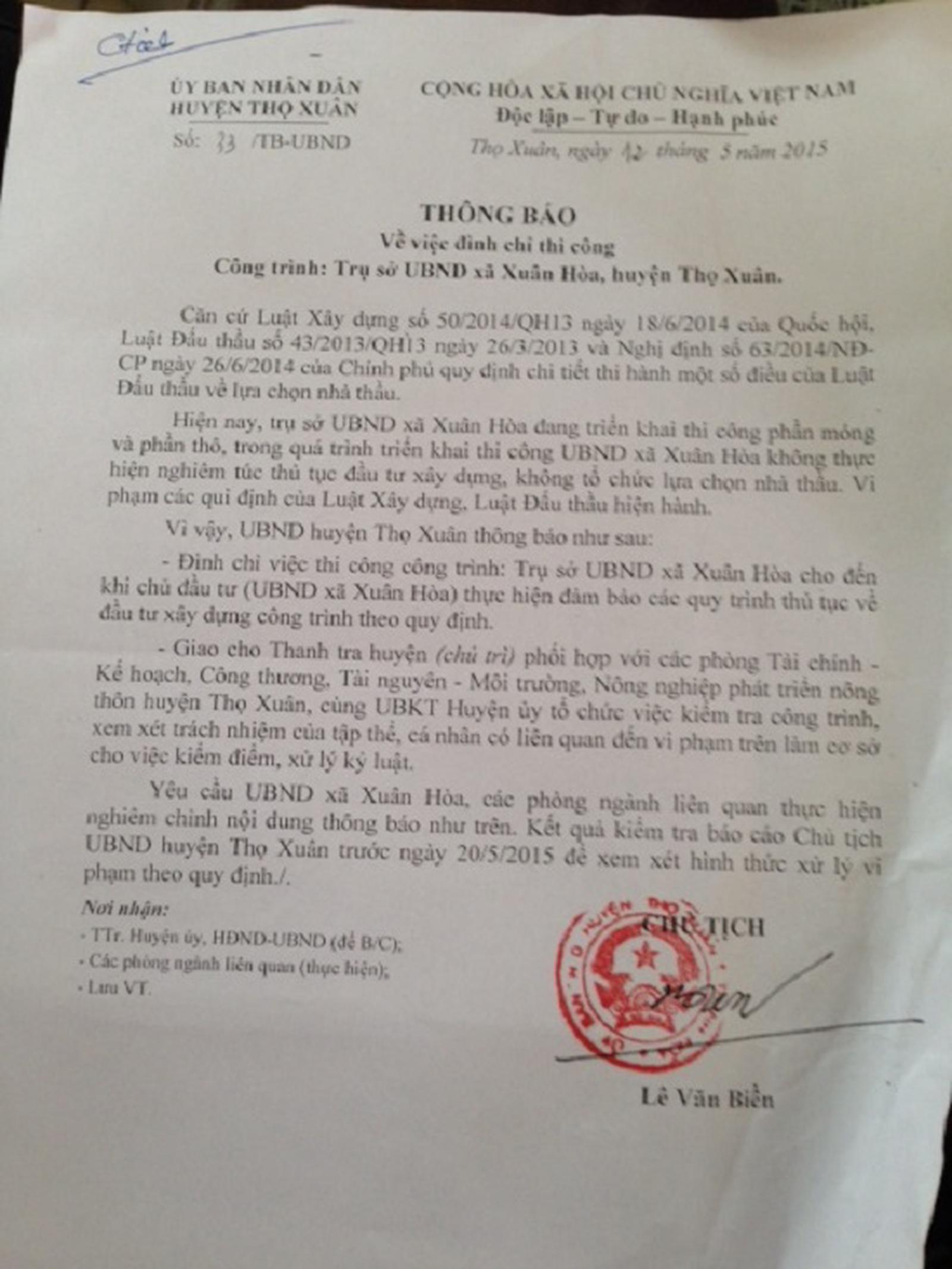 Thông báo đình chỉ xây dựng của UBND huyện Thọ Xuân. Ảnh: Văn Thanh