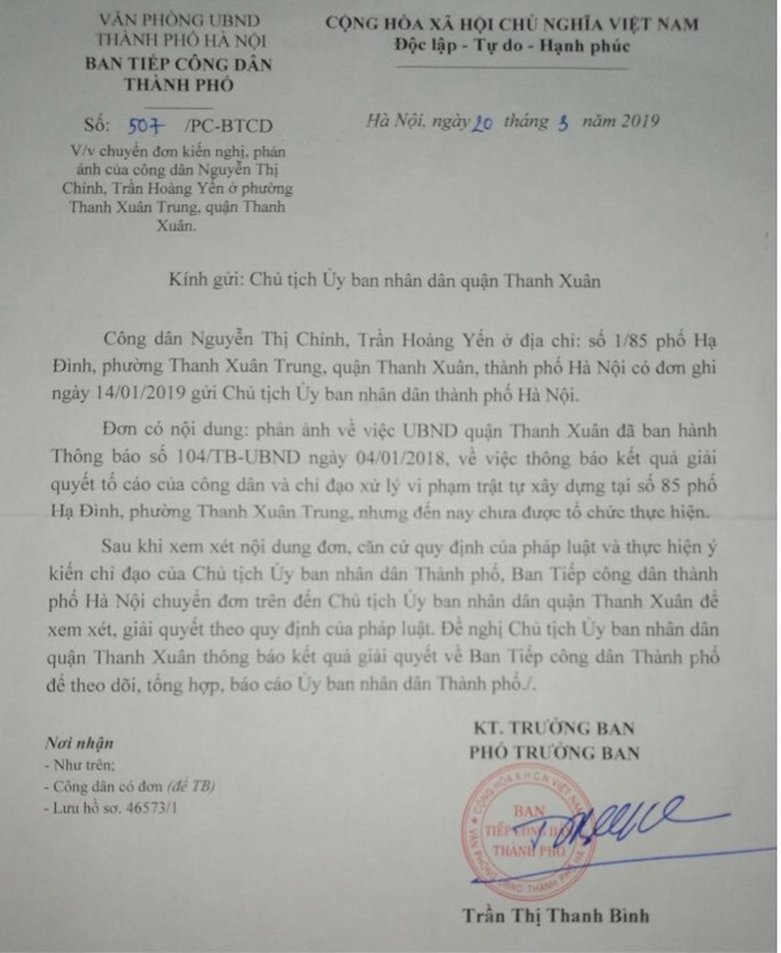 Mặc dù hàng loạt cán bộ bị xử lý, nhưng đến giờ công trình vi phạm của ông Thủy vẫn tồn tại? Ngày 20/3/2019, Văn phòng UBND TP Hà Nội - Ban Tiếp công dân tiếp tục có Văn bản số 507 gửi Chủ tịch UBND quận Thanh Xuân đề nghị Chủ tịch UBND quận Thanh Xuân giải quyết vụ việc theo quy định của pháp luật.