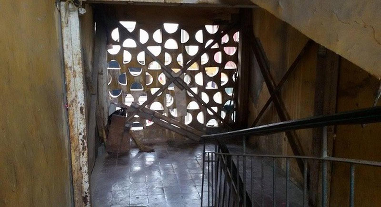 Khảo sát tại khu đơn nguyên 2, chúng tôi cảm nhận được sự bất an bởi bề mặt cầu thang nghiêng lệch về 1 bên, ngay từ chiếu nghỉ cầu thang tầng 1 nối tầng 2 lên tới tận tầng 5 hoàn toàn được chống bằng cừ, khung sắt. Điểm nối giữa tường gạch và trần nhà bị nứt chạy dọc như trực “xé” toạc ra. Lo ngại hơn, 2 đơn nguyên bị nghiêng và đang bị tách ra theo hình chữ V, khiến không chỉ cư dân sống trong tòa nhà này mà với bất kì ai nhìn từ ngoài vào cũng có cảm giác bất an.