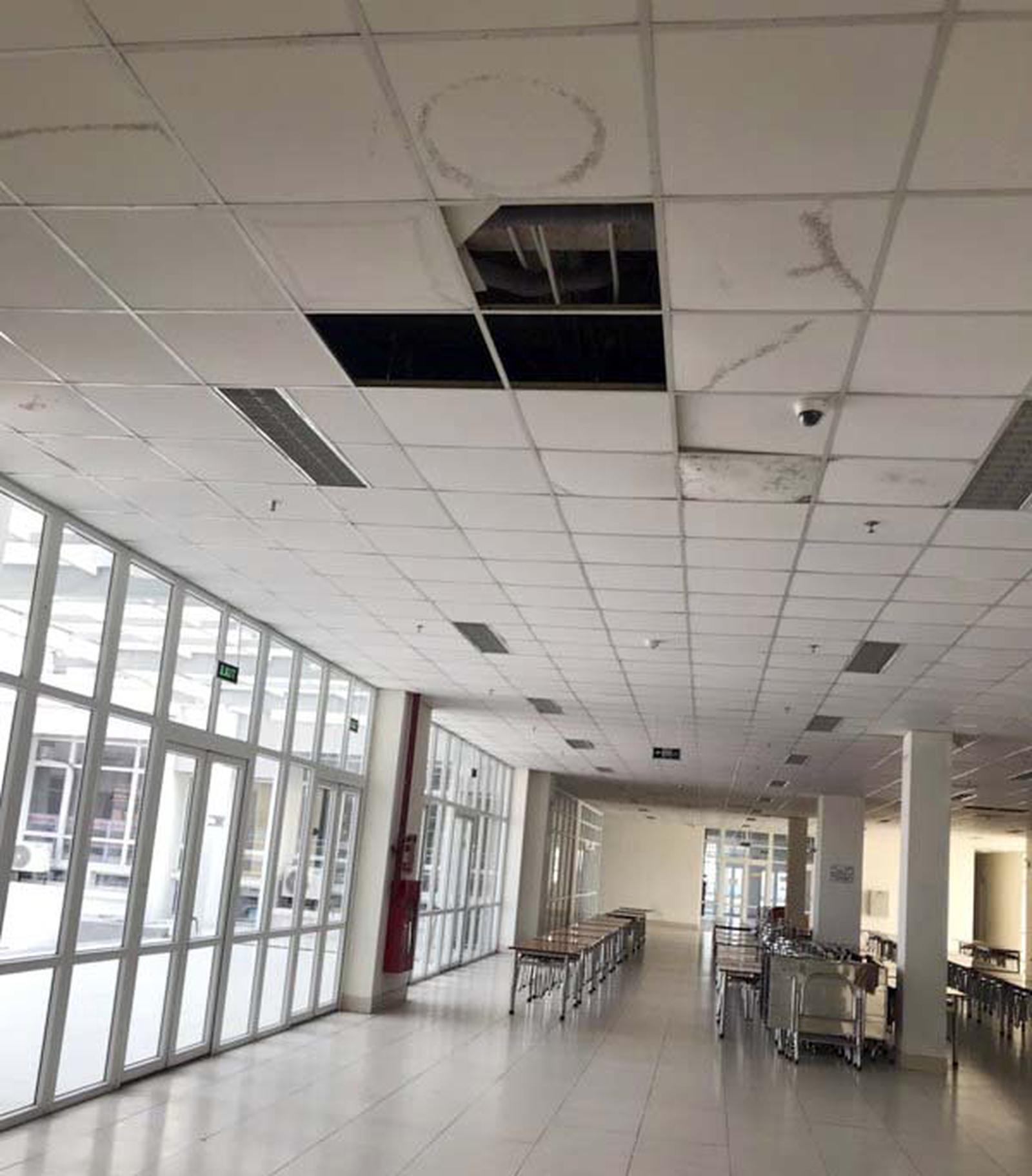 Những tấm phông trần tại khu ký túc xá bung bét mặc dù mới đưa vào sử dụng. Ảnh: Nam Dũng