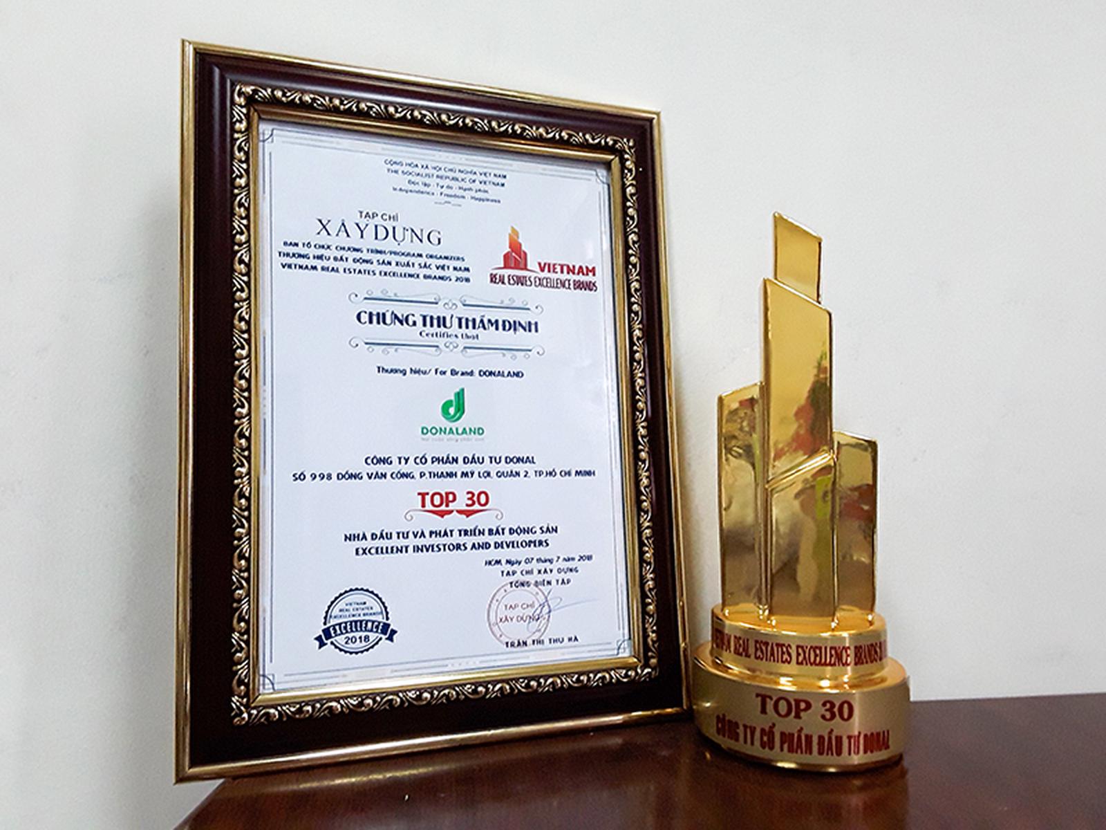 Sau những thành công và quá trình hoạt động, Donaland đã vinh dự được lọt top 30 thương hiệu bất động sản xuất sắc năm 2018 do Tạp chí Xây dựng phối hợp cùng Vietnam Real Estates Excellence Brands thực hiện.