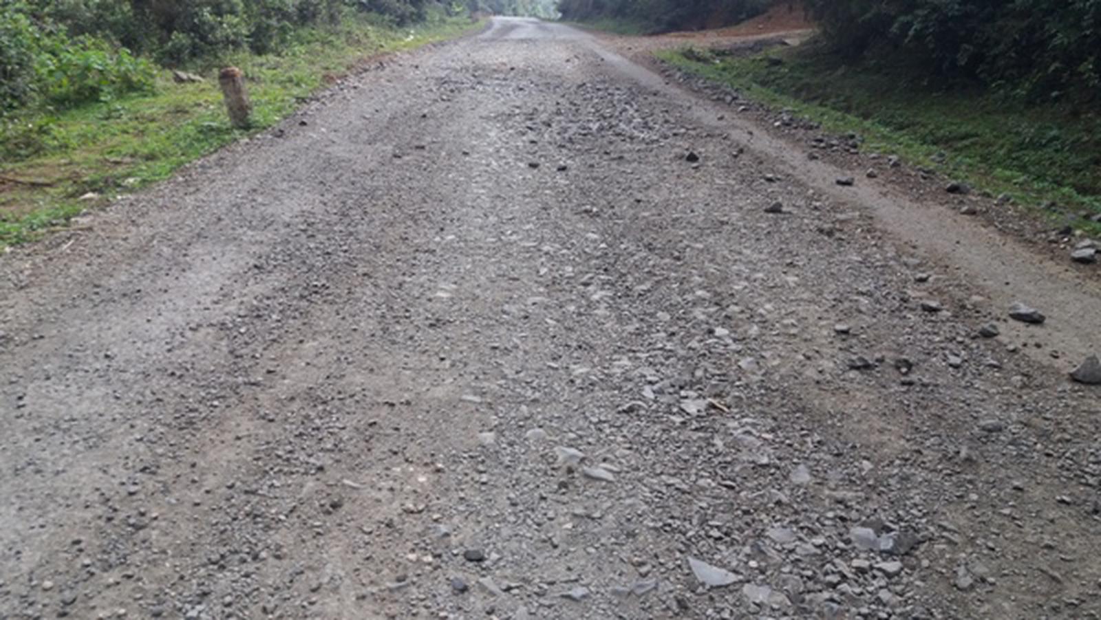 Đoạn đường bong tróc, xuất hiện những cục đá to nằm giữa lòng đường gây mất an toàn giao thông. Ảnh: KN