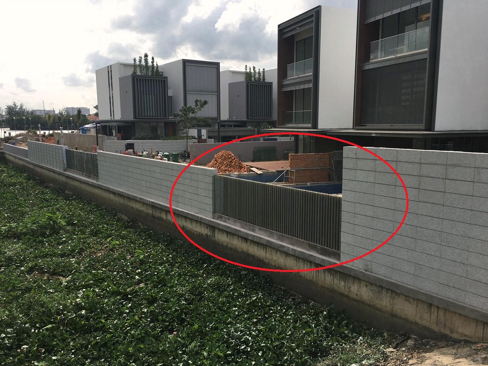 Ngày 13/7/2017, ghi nhận tại hiện trường thì 2 công trình hồ bơi xây dựng sai phép nằm sát rạch Ông Hóa chưa được phá dỡ. Ảnh:CT