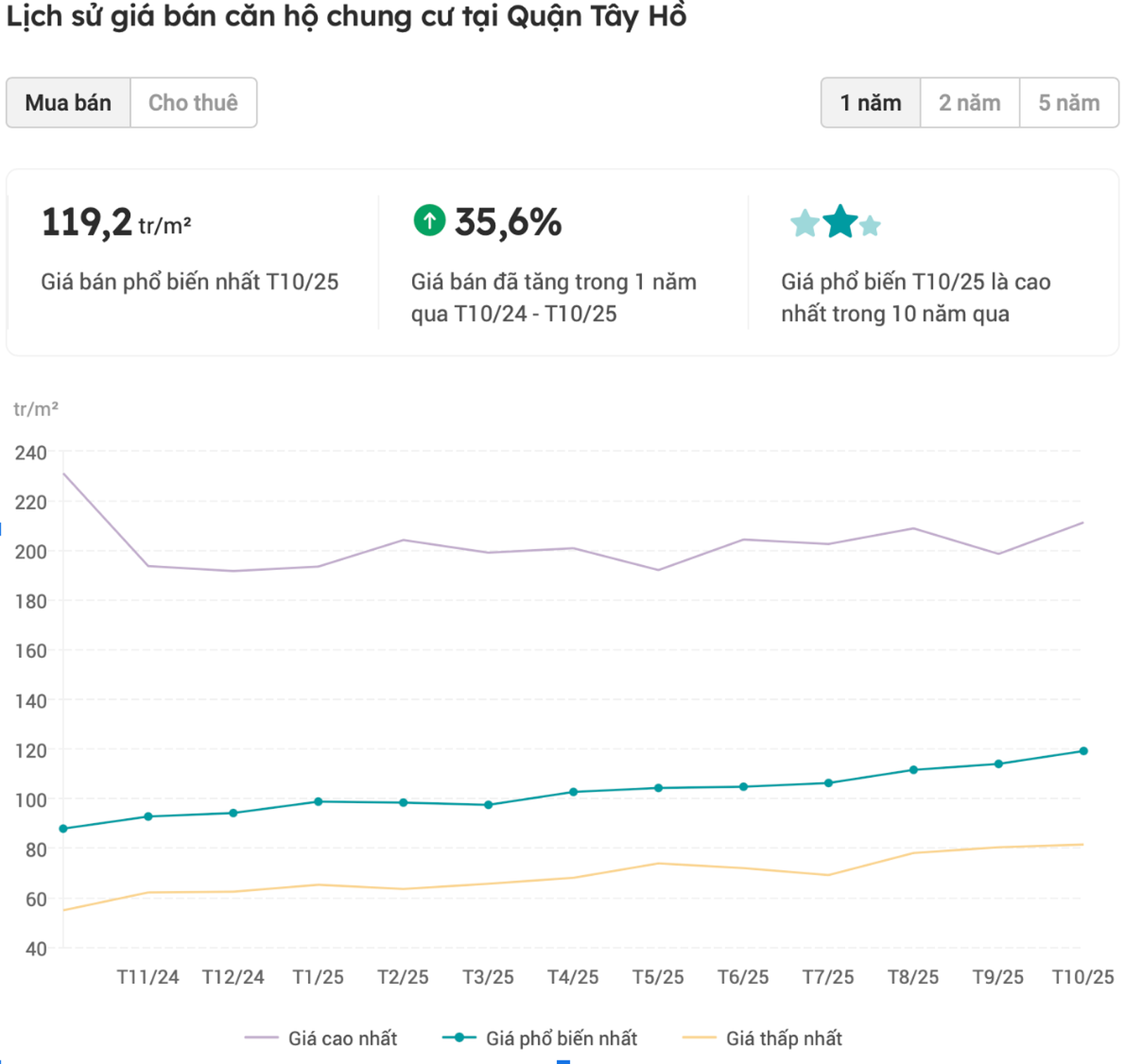 Lịch sử giá bán căn hộ chung cư tại quận Tây Hồ (cũ). Nguồn: Batdongsan.com.