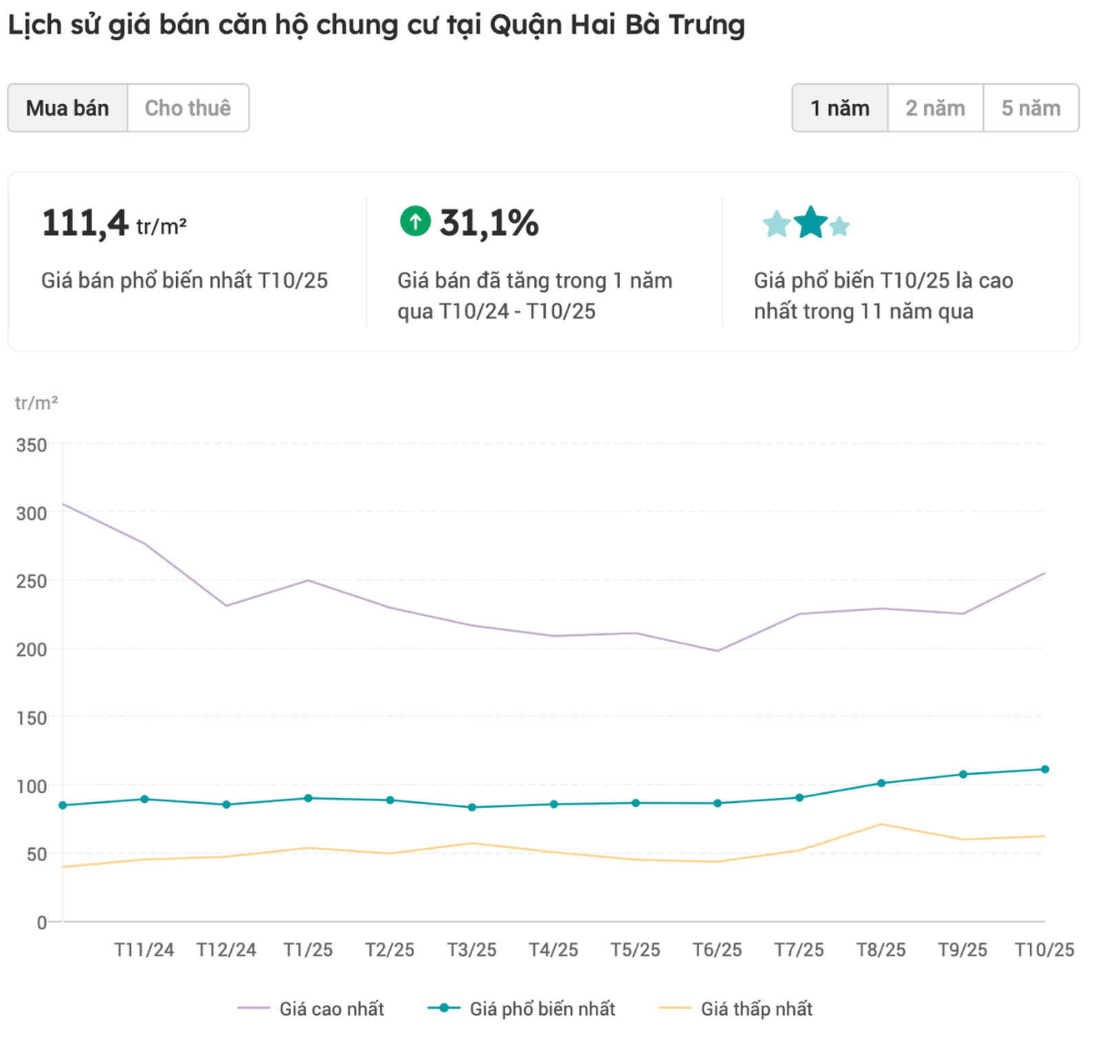 Tại Hai Bà Trưng, nơi có đại dự án Times City, giá bán tiếp tục duy trì mức cao, dao động từ 62 đến 255 triệu đồng/m2, phổ biến 80-140 triệu đồng/m2. Quý III/2025 ghi nhận mức tăng 10-15% so với quý trước và trung bình 31,1% so với cùng kỳ năm ngoái.