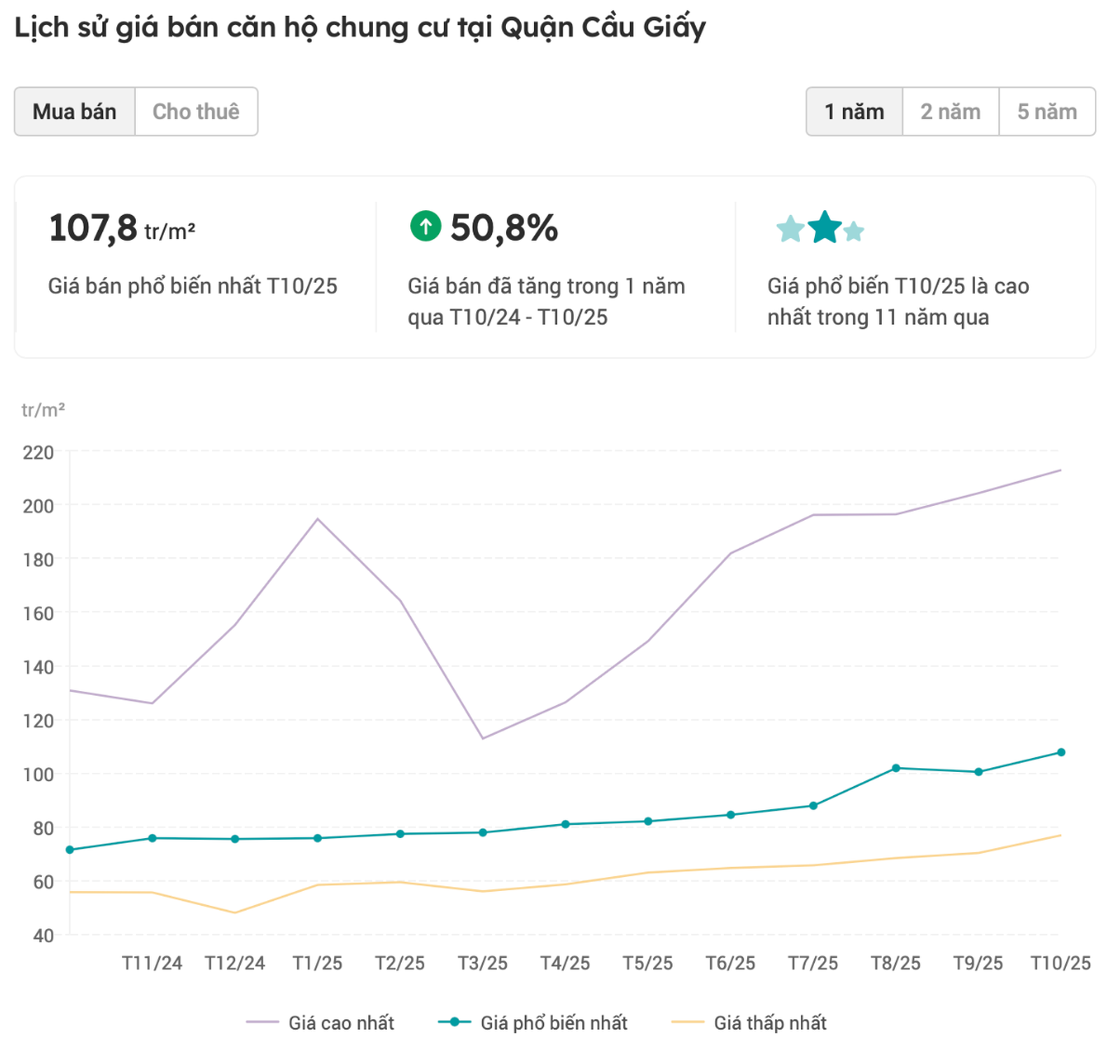 Lịch sử giá bán căn hộ chung cư tại quận Cầu Giấy (cũ). Nguồn: Batdongsan.com.