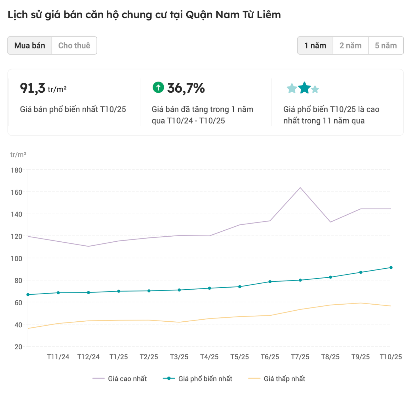 Nếu so với cùng kỳ năm 2024, mặt bằng giá tại Nam Từ Liêm đã tăng khoảng 36,7%, phản ánh nhu cầu lớn của người dân dần dịch chuyển ra sinh sống tại các khu vực vùng ven Hà Nội.