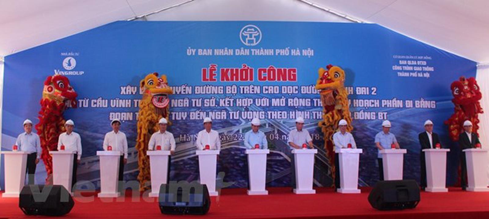 Ủy ban Nhân dân thành phố Hà Nội vừa chính thức khởi công dự án xây dựng tuyến đường bộ trên cao dọc đường vành đai 2, đoạn từ cầu Vĩnh Tuy đến Ngã Tư Sở, kết hợp với mở rộng đoạn đường bằng từ Vĩnh Tuy đến Ngã Tư Vọng với tổng mức đầu tư gần 9.500 tỷ đồng theo hình thức BT (xây dựng-chuyển giao) vào sáng nay (22/4).