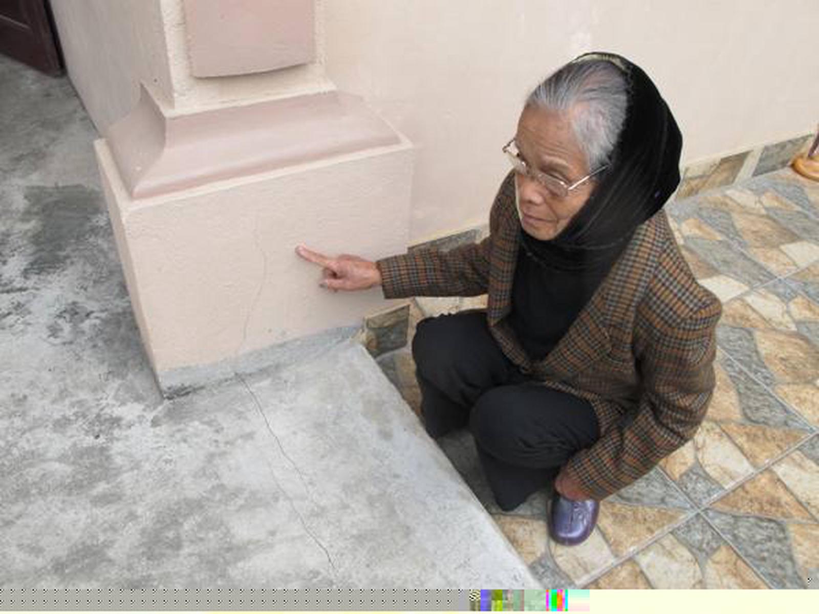 Đi quanh nhà ông bà Điệp, nhìn những vết nứt cắt dọc bức tường, cảm tưởng như chỉ cần một dư chấn nhỏ, bức tường cũng nở toác, đổ sập. Nhìn trần nhà tầng 1, tầng 2 càng thấy nguy hiểm. Đường nứt chằng chịt, cắt trần nhà ra từng mảnh. Bà Tâm nói không ngoa chút nào. Mưa thì trong nhà như ngoài sân là cái chắc. Nguy hiểm nhất là nước mưa sẽ làm hư hỏng sắt đan mái trần, hậu quả sẽ khó mà lường hết được.