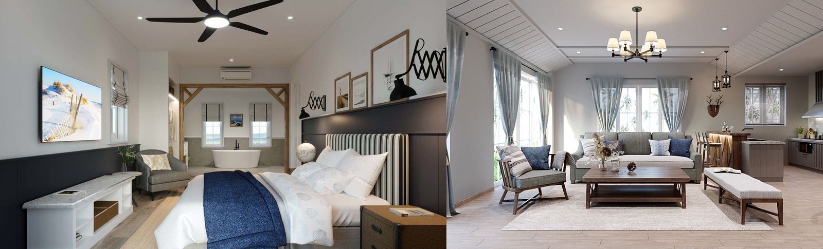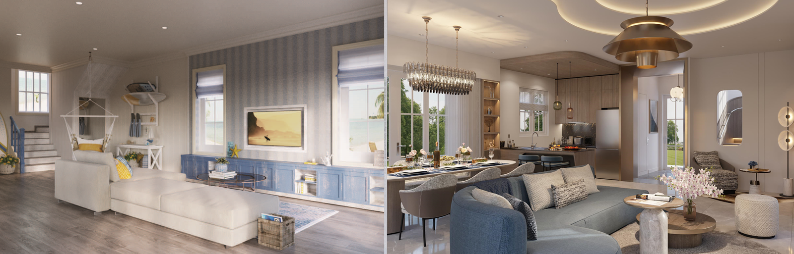 Bên cạnh chủ đề thiết kế về lifestyle, các phong cách nội thất khác được lấy cảm hứng từ lối kiến trúc đặc trưng của vùng biển nước Mỹ. Chủ đề Beach House lột tả sinh động những ngôi nhà gỗ trên bờ biển miền nam nước Mỹ, với những khung cửa sổ rộng đầy nắng, những mái dốc đặc trưng; hay những chất liệu chút thô nhám của những mảng tường và trần gỗ… Khác với phong cách thô sơ mộc mạc của Beach House, chủ đề Luxury Yacht lấy cảm hứng từ những chiếc du thuyền hạng sang bóng bẩy với những đường cong và những vật liệu sang trọng. Nội thất chủ đề này tạo nên không gian du thuyền đẳng cấp, đậm chất thượng lưu Mỹ ngay bên trong các căn second home hướng biển tại NovaWorld Phan Thiet. Nội thất được biến hóa theo 4 mùa xuân - hạ - thu - đông, mang đến không gian đặc trưng cho từng căn.