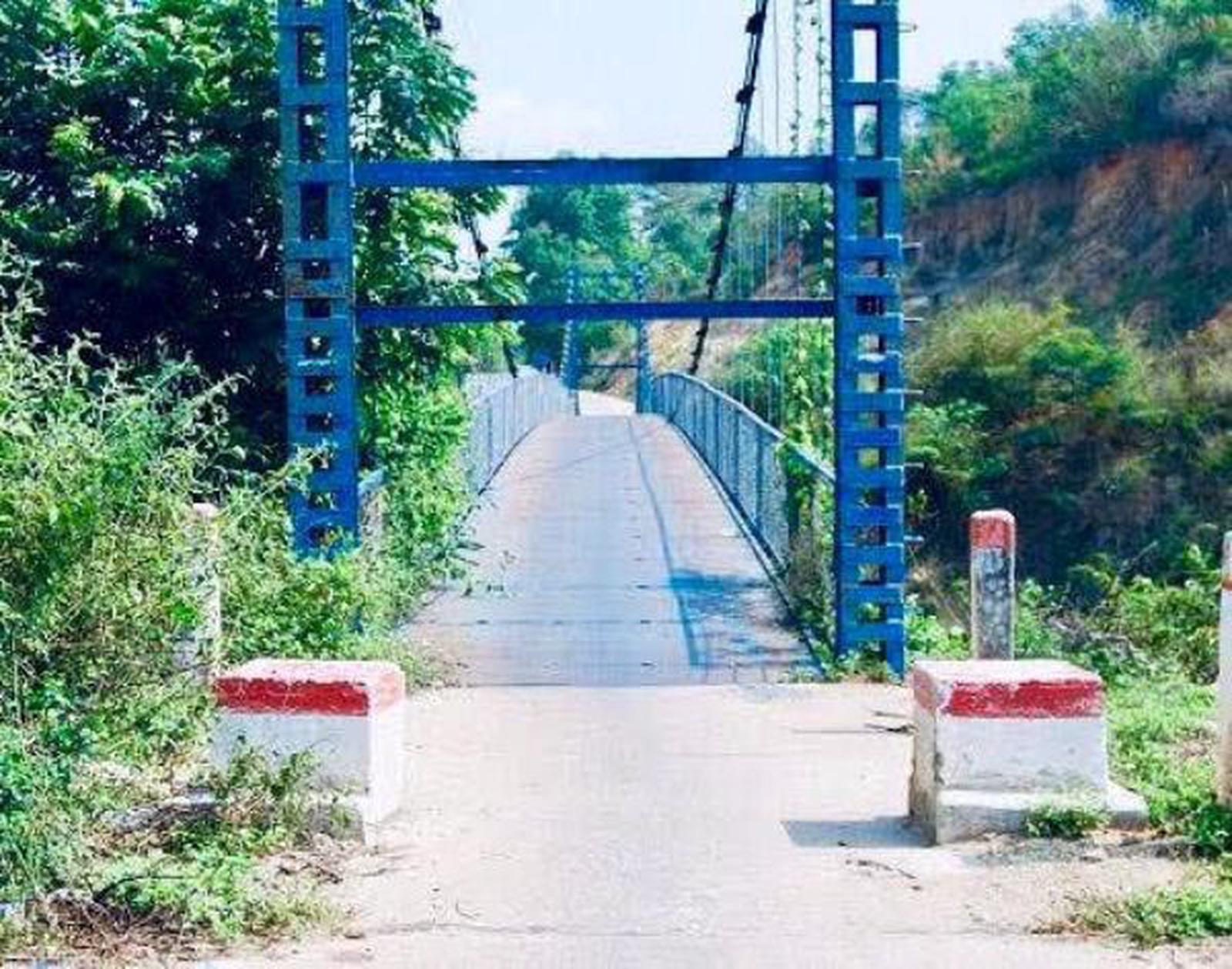 Cầu treo xây dựng có thanh sắt và bê tông chắn ngang, khiến xe tải không thể chở gia súc qua được. Ảnh: Khuất Nguyên