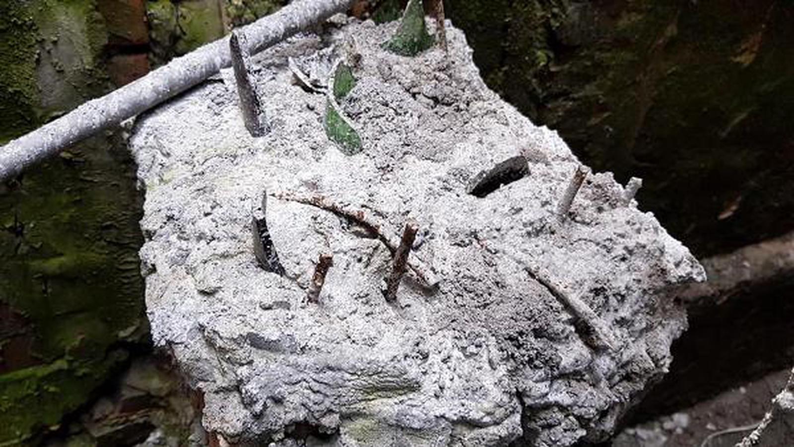 Phía trên trụ ngăn dòng chảy được gắn sắt và mảnh sành gây phản cảm. Ảnh: TA