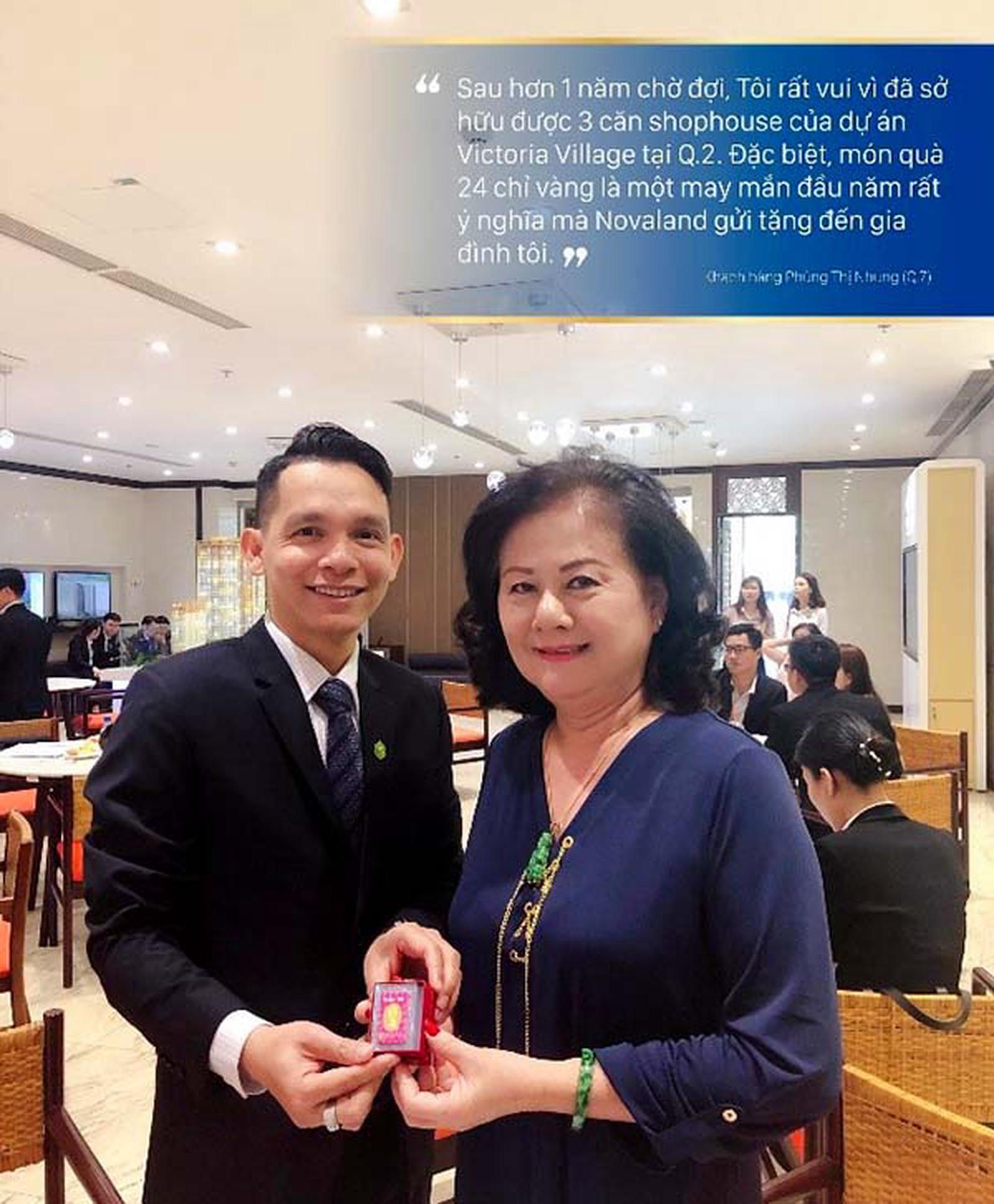 “Sau hơn 1 năm chờ đợi, Tôi rất vui vì đã sở hữu được 3 căn shophouse của dự án Victoria Village tại Q.2. Đặc biệt, món quà 24 chỉ vàng là một may mắn đầu năm rất ý nghĩa mà Novaland gửi tặng đến gia đình tôi” – chia sẻ của Khách hàng Phùng Thị Nhung (Q.7) chia sẻ khi tham dự sự kiện giới thiệu sản phẩm shophouse Victoria Village.