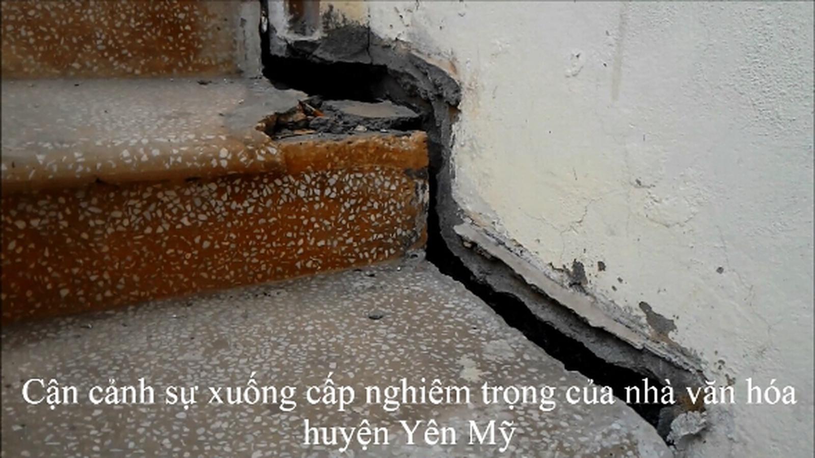 Mục sở thị NVH huyện Yên Mỹ, phóng viên ghi nhận tình trạng lún, nứt xảy ra nghiêm trọng tại nhiều vị trí xung yếu của công trình. Nhiều vết nứt chạy dài hàng mét trên tường hay cạnh cầu thang bộ đang “ngoác miệng” rộng ra và chưa có dấu hiệu dừng lại. Tại các cột trục 1, 2 của công trình cũng xuất hiện tình trạng nứt có tiến triển cả về chiều rộng và dài.