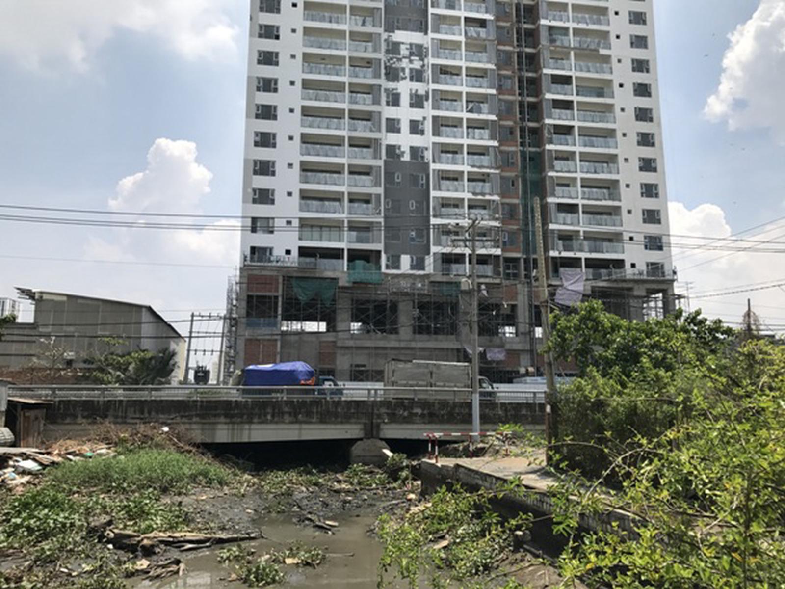 Ngược lại, ngay khu vực đường Đào Trí, phường Phú Thuận, đường thoát nước ra sông Sài Gòn đang bị hàng loạt công trình xây dựng bóp nghẹt. Trong đó có tòa tháp 25 tầng có tên An Gia Riverside, do Công ty Cổ phần Đầu tư bất động sản Gia An làm chủ đầu tư có diện tích sàn xây dựng hơn 61.000m2, với 246 căn hộ, nằm sát cạnh cầu bắc qua con rạch.