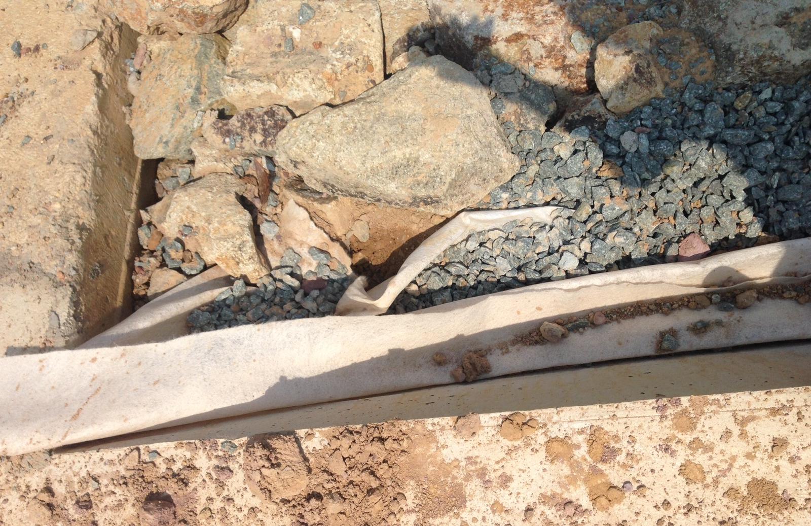 Trước khi xếp đá hộc dày 30cm, bờ kè bắt buộc phải phủ một lớp vải địa kỹ thuật, sau đó rải thêm một lớp đá dăm 10cm. Ảnh: Trần Quốc