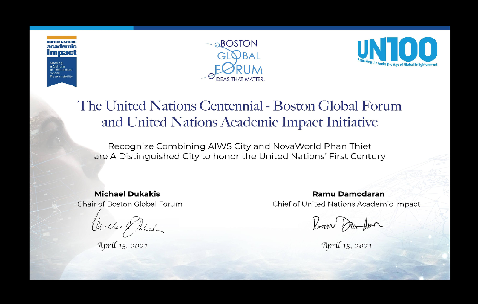 Ngoài ra, sự kết hợp giữa NovaWorld Phan Thiet và thành phố xã hội trí tuệ nhân tạo (AIWS City) đã được công nhận là thành phố tiêu biểu tôn vinh 100 năm Liên hợp quốc bởi Diễn đàn Toàn cầu Boston và Phân viện Tác động Học thuật của Liên hợp quốc. Đây cũng là cơ hội để Novaland trở thành thương hiệu toàn cầu.