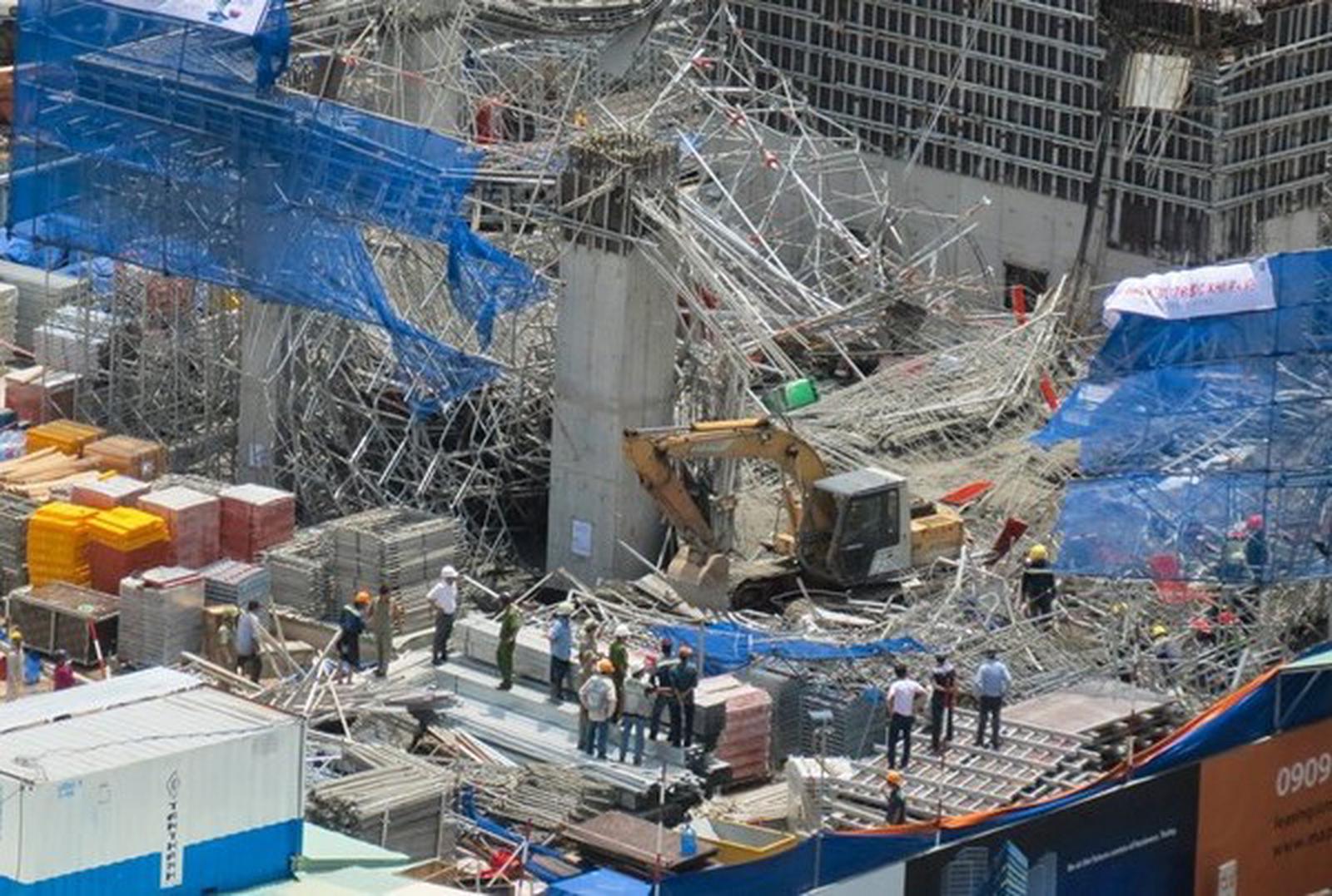 Hiện trường vụ sập giàn giáo công trình 17 tầng ở Sài Gòn, 2 người tử vong. Ảnh: QT