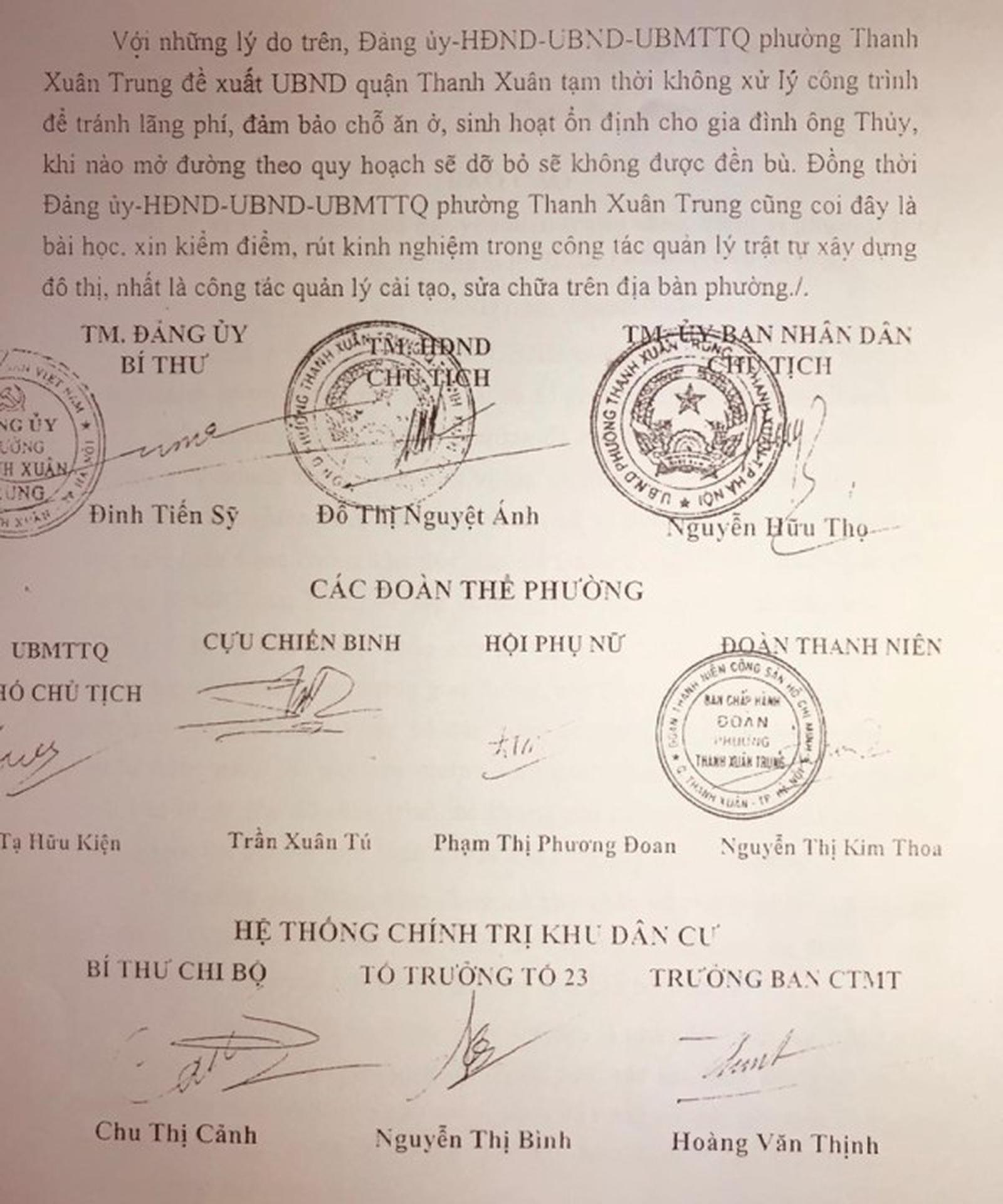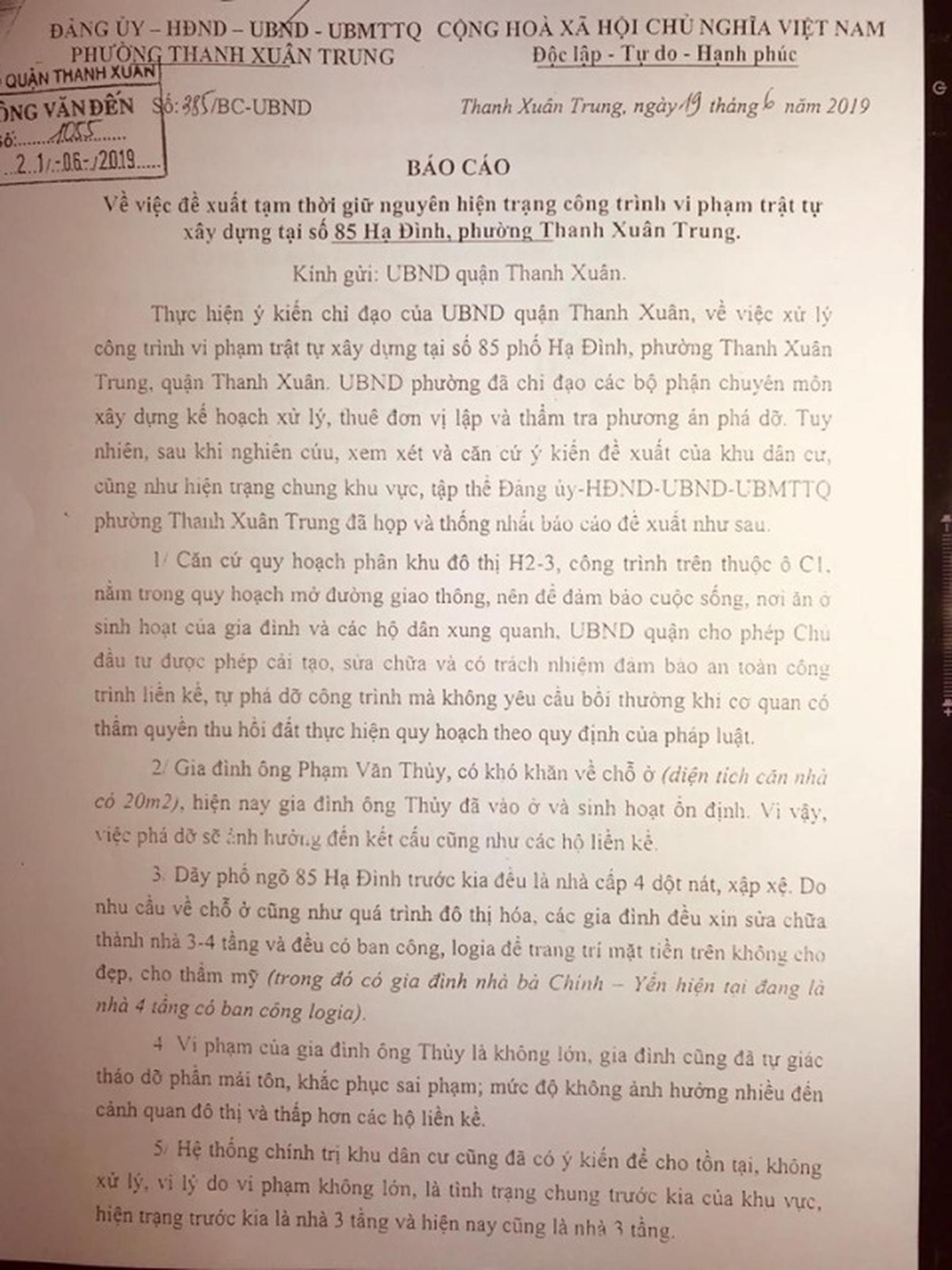 Báo cáo đề xuất của Đảng ủy - HĐND - UBND - Ủy ban MTTQ phường Thanh Xuân Trung, cho công trình sai phạm... được tồn tại. Ảnh: Trần Quý