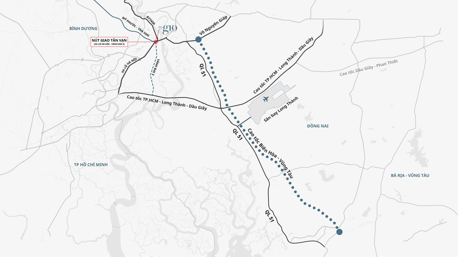 Ở hướng kết nối TP HCM - Biên Hòa - Long Thành, nhà ga S2.1 nằm đối diện Dự án The Gió Riverside được xem là một mắt xích chiến lược trong lộ trình phát triển trục giao thông công cộng xuyên vùng phía Đông. Ga này không chỉ kết nối trực tiếp với trung tâm hành chính mới tỉnh Đồng Nai - Biên Hòa Đông Phố, mà còn được quy hoạch liên thông tuyến Metro số 1 hiện hữu, tạo thành hành lang di chuyển liên hoàn từ trung tâm TP HCM đến sân bay quốc tế Long Thành.