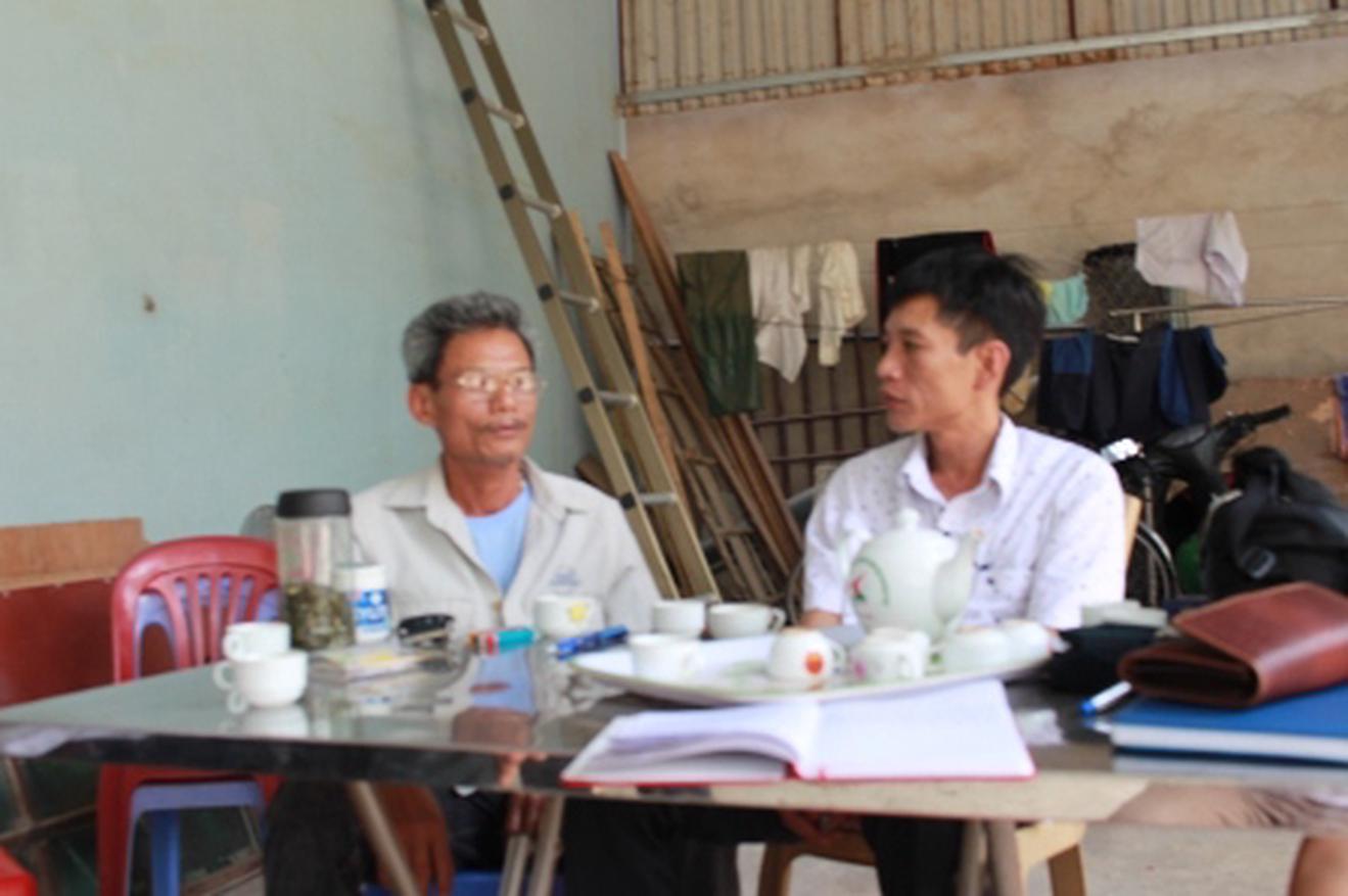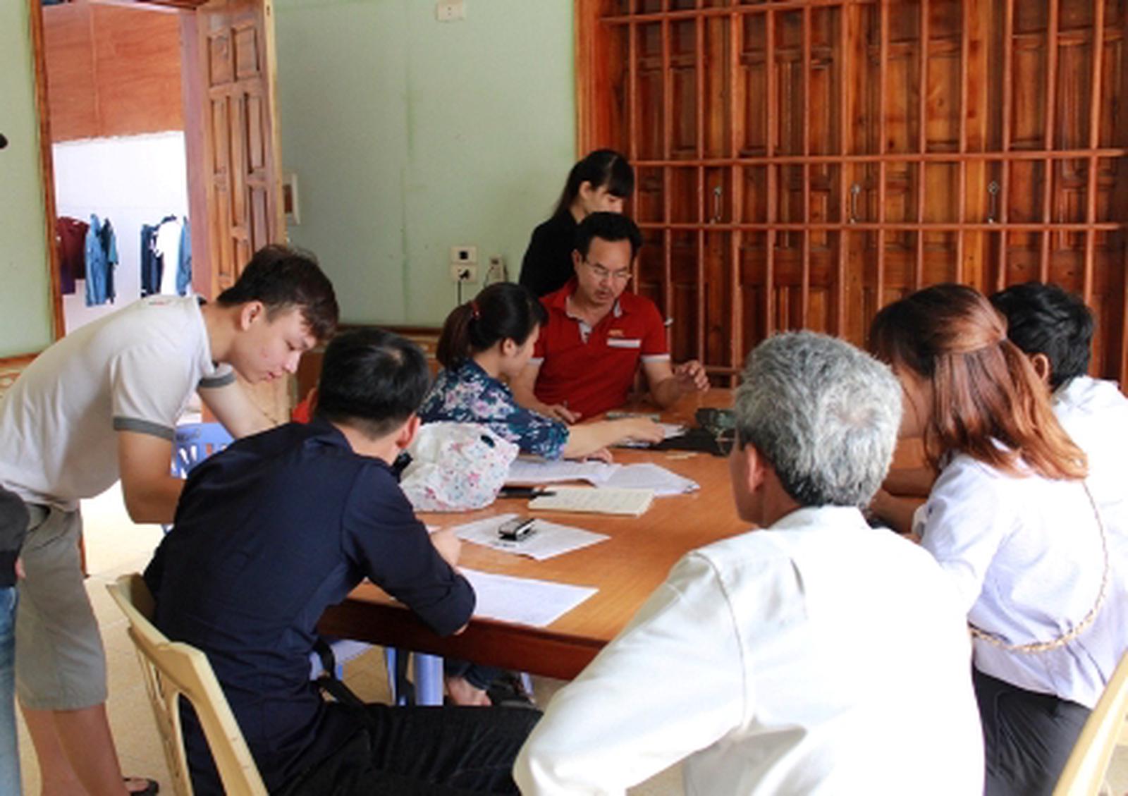 Giám đốc Mai Cao Cường trao đổi với người dân xã Mai Lâm đến nhận tiền bồi thường, hỗ trợ. Ảnh: Trần Lê