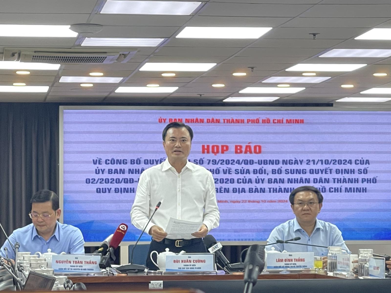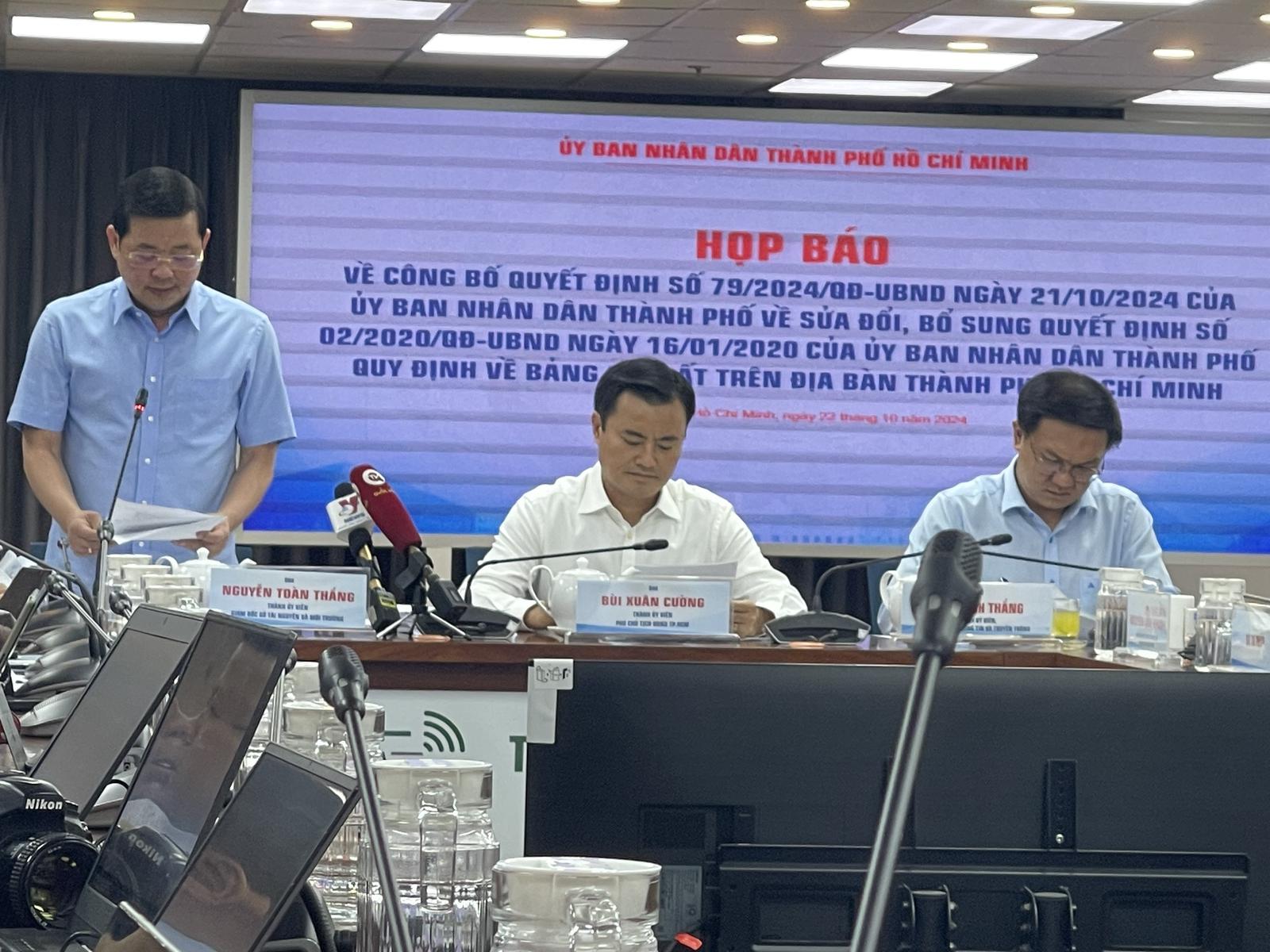 Tại buổi họp báo, ông Nguyễn Toàn Thắng, Giám đốc Sở Tài nguyên và Môi trường TP Hồ Chí Minh công bố nội dung chủ yếu của Quyết định số 79/2024/QĐ-UBND ngày 21/10/2024 của UBND về sửa đổi, bổ sung Quyết định số 02/2020/QĐ-UBND ngày 16/1/2020 của UBND TP quy định về bảng giá đất trên địa bàn TP.