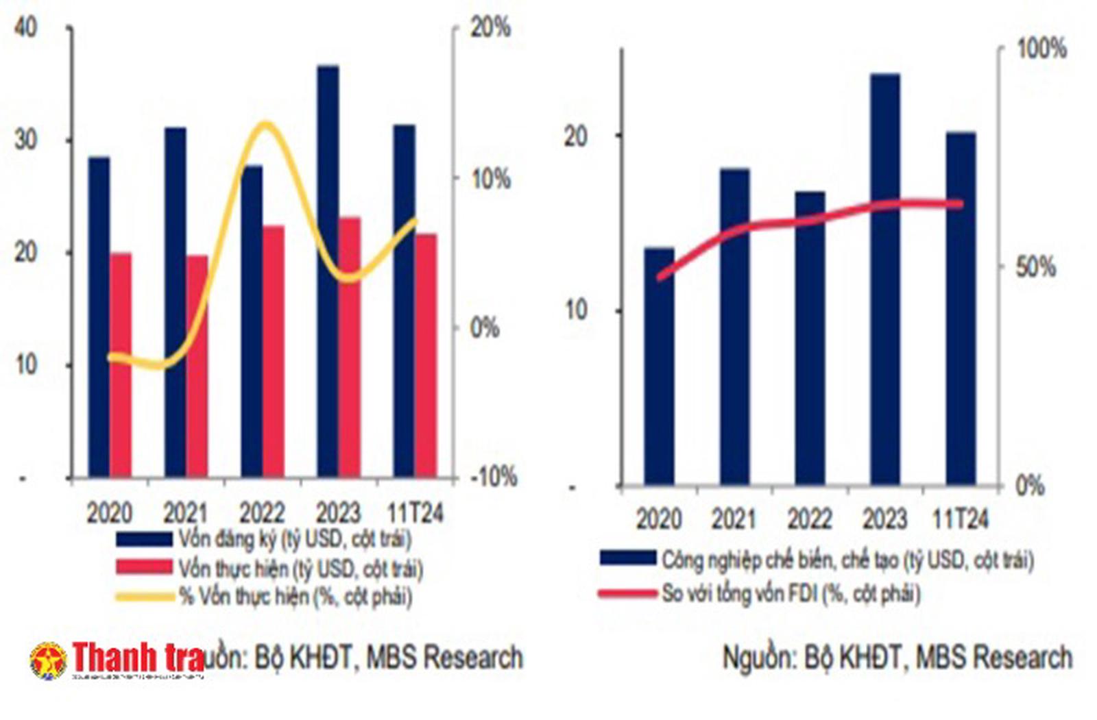 Dòng vốn FDI chảy vào Việt Nam khả quan với vốn đăng ký và vốn thực hiện trong 11 tháng đầu năm 2024 tăng trưởng lần lượt 1% và 7% so với cùng kỳ.