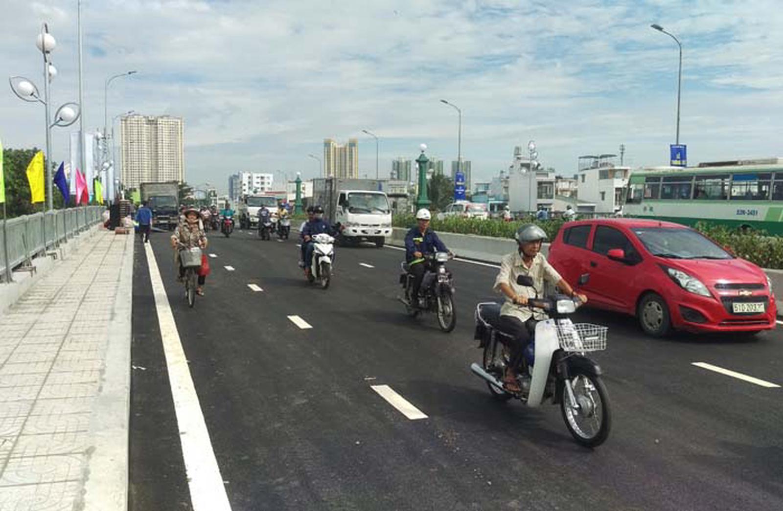 Ngay sau lễ thông xe, Sở Giao thông Vận tải TP Hồ Chí Minh tổ chức cho các loại phương tiện chạy một chiều qua cầu Nhị Thiên Đường 1. Ảnh: CN