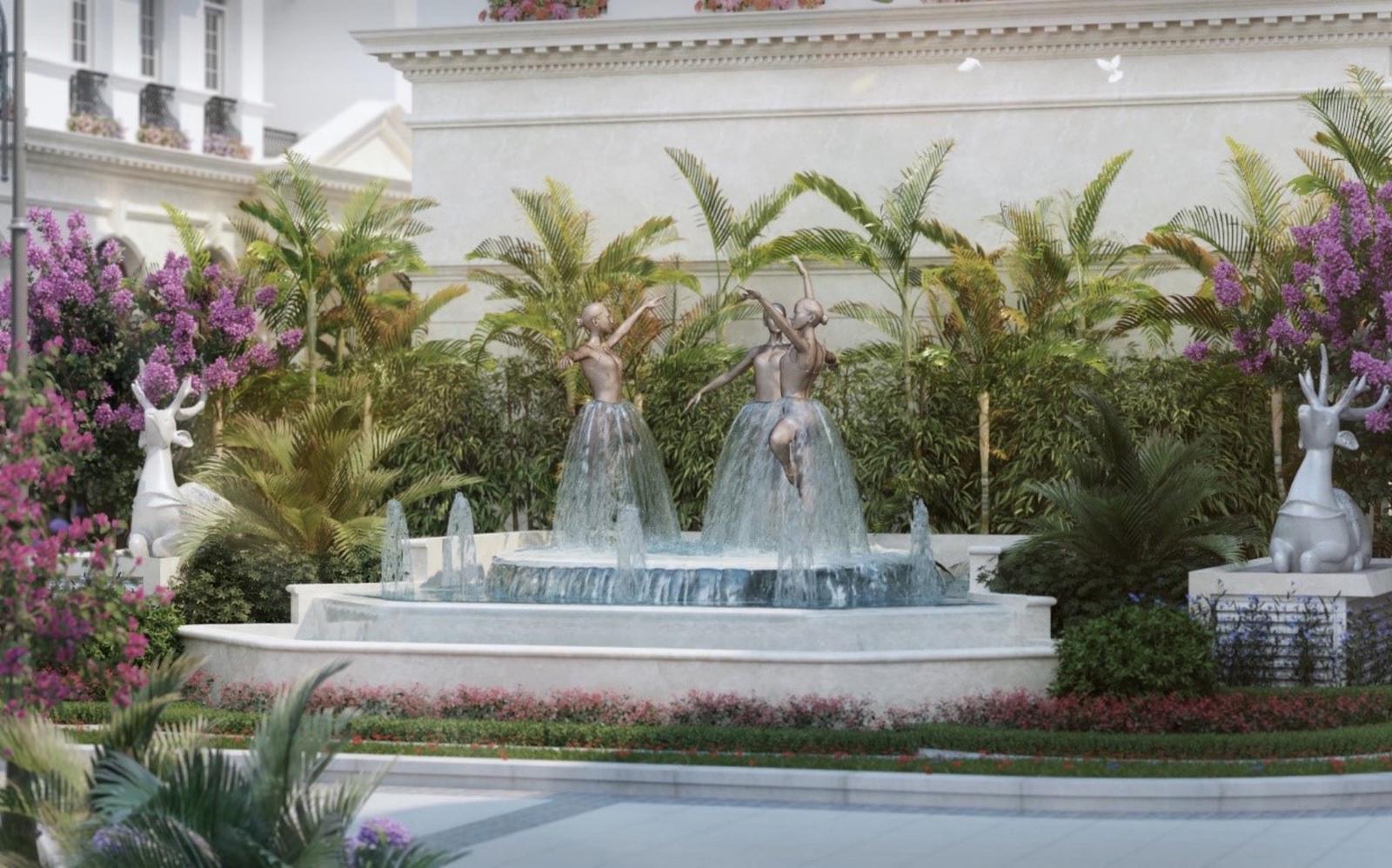 Dự án là điểm chạm của những màu xanh thư thái: sắc xanh của khu vườn Châu Âu, sắc xanh dương từ đài phun nước và bầu trời hòa quyện trong một không gian yên bình, nơi 110 chủ nhân thu cả đất trời vào trước tư gia.