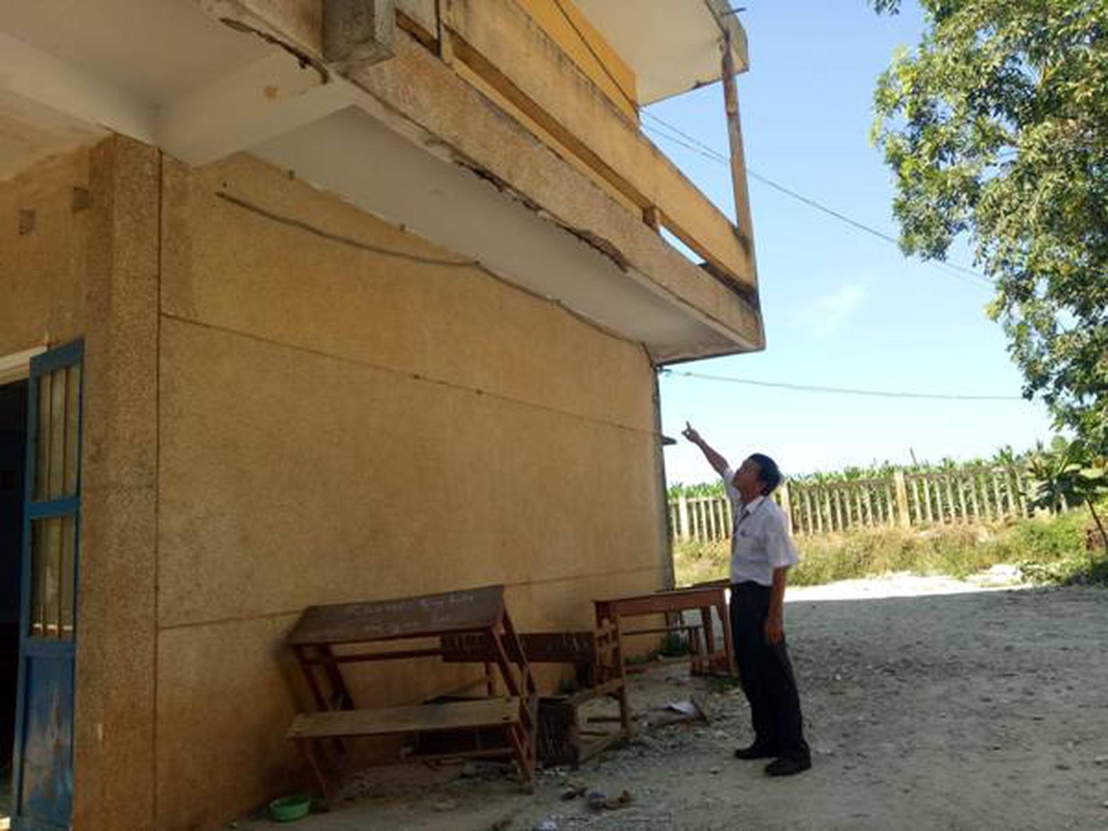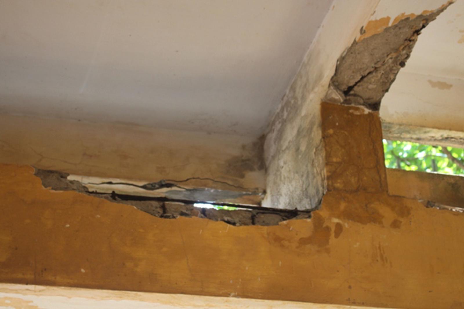 Theo ghi nhận của PV, từ các dãy phòng học, có nhiều vị trí nứt toác, nhiều vết nứt sâu và kéo dài cả mét, ngay tại hệ thống dãy nhà 2 tầng, những vết nứt ở phía lối hành lang có chiều dài 40cm lộ rõ các thanh sắt bên trong. Những mảng bê tông trên trần nhiều điểm đã bong tróc, rơi xuống đất. Nguy hiểm hơn, bê tông dầm và một số cột đã bong gần hết để lộ cốt sắt bên trong đang mục nát; ở một số điểm dùng tay không cũng có thể bóc được các mảnh bê tông ra ngoài.