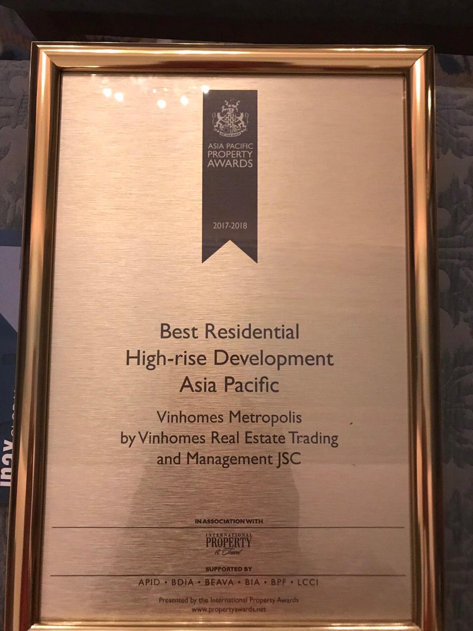 Vượt qua các vòng đánh giá nghiêm ngặt của Hội đồng giám khảo quốc tế International Property Awards (IPA) và những đề cử nổi bật cấp quốc gia và khu vực - Vinhomes Metropolis đã giành chiến thắng thuyết phục tại hạng mục “Tòa nhà cao tầng tốt nhất Châu Á Thái Bình Dương" 2017.